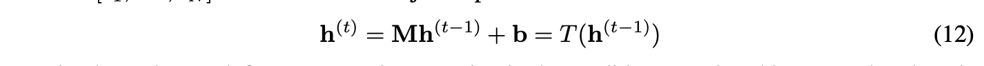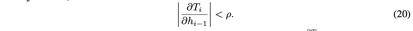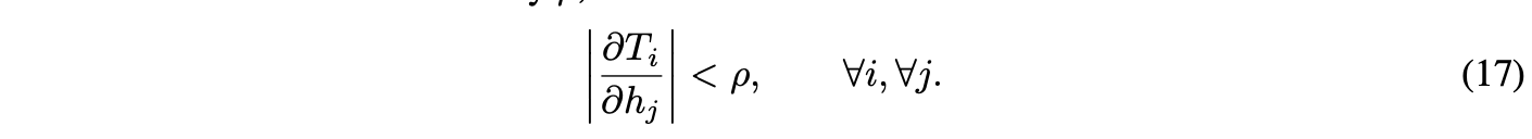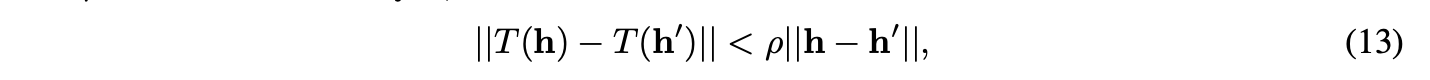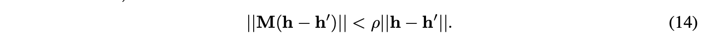 设σ为任意非线性函数,定义变换T(h) = σ(Mh + b)。将T(h)表示为[T₁(h), ..., T_N(h)]ᵀ,其中T_i(h^(t−1)) = h^(t)。根据收缩映射的定义(式13),T的雅可比矩阵的每个元素的绝对值均以ρ为界。
