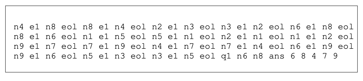 该描述定义了一个包含两个环路的图:主目标环路 3-7-5-8-6 和干扰子图 1-2-4-0。所有边均以双向形式呈现两次以保证对称性。任务要求根据给定的起始两个节点及方向(从第一个节点指向第二个节点)找到对应的环路。干扰子图的加入提高了任务难度,导致输出环路并非严格意义上的"欧拉环"。对于RNN和LSTM模型,上述训练样例会被进一步转换为令牌序列。