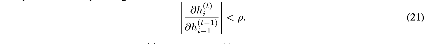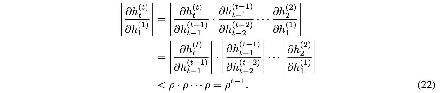 当 ρ < 1 时,该导数会随着 t 的增长以指数级速度趋近于 0。直观上,这意味着一个节点对远处另一个节点的影响会呈指数级衰减,因此难以建模长距离依赖关系。