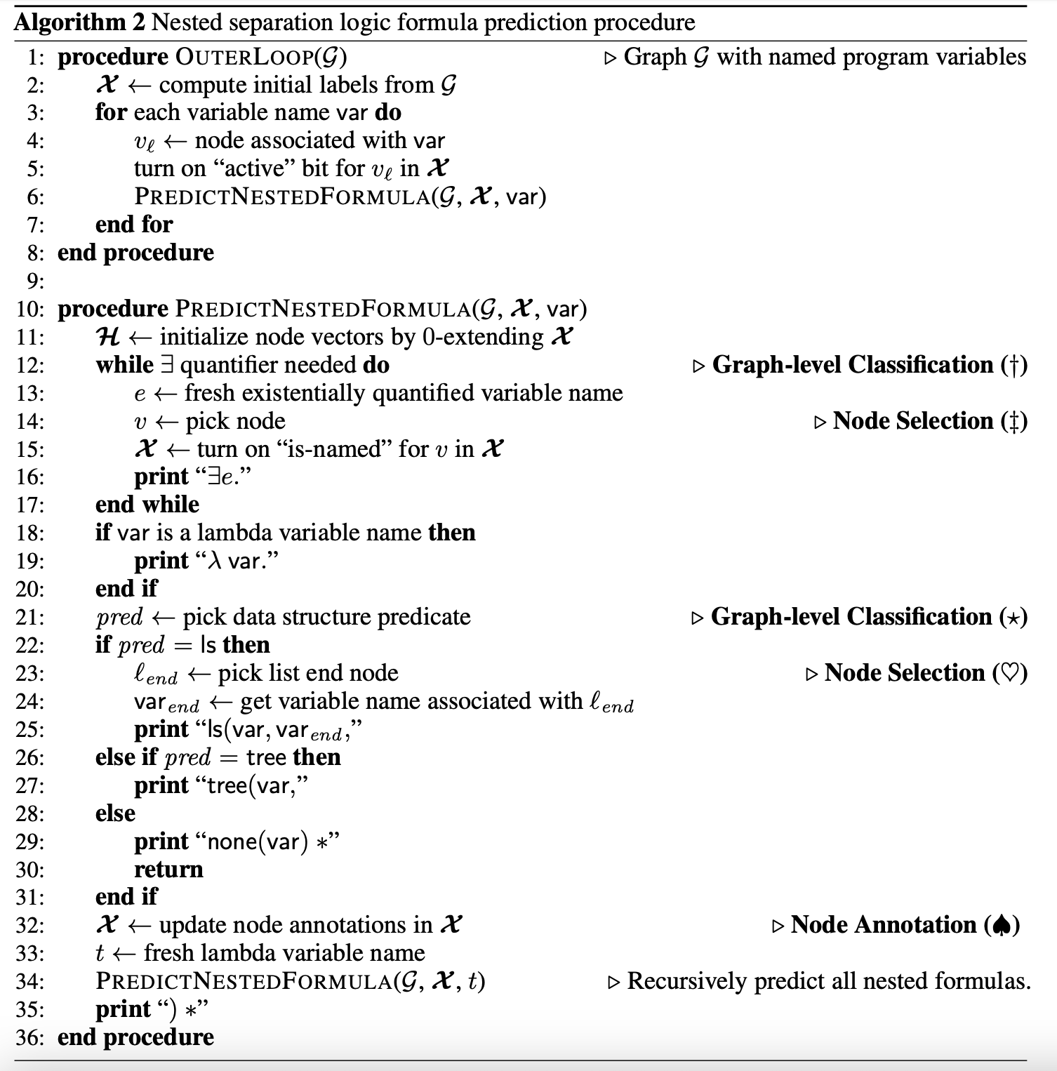 为使GGS-NN能够预测嵌套公式,将算法1调整为算法2。外层循环遍历每个命名变量一次,并生成以该变量关联节点为活动节点的嵌套谓词。嵌套预测过程与算法1类似。在递归调用嵌套预测过程前,第32行的节点标注更新不仅将当前结构中的节点标注为"已解释",还会将所有通过当前结构中节点val指针链接的节点标注为"活动"。以列表的列表为例,预测ls(x, y,后,标注步骤将x到y列表中的所有节点标注为"已解释",并将这些节点val指针指向的所有节点标注为"活动"。该行为并非硬编码到算法中,标注模型可从数据中学习此模式。