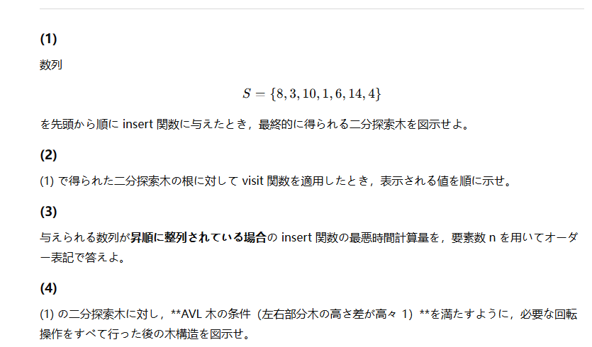 (1)で得られた木について,各頂点の左右部分木の高さ差はすべて 1 以下である。