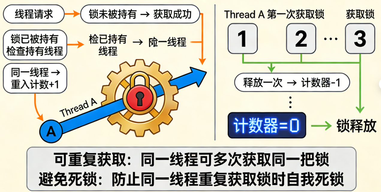 可重入性:可重入锁允许同一个线程多次获得锁。如果线程已经获得了锁,那么它可以再次获得该锁而不会被阻塞。这种机制非常适合于递归调用或者有复杂逻辑的代码块。