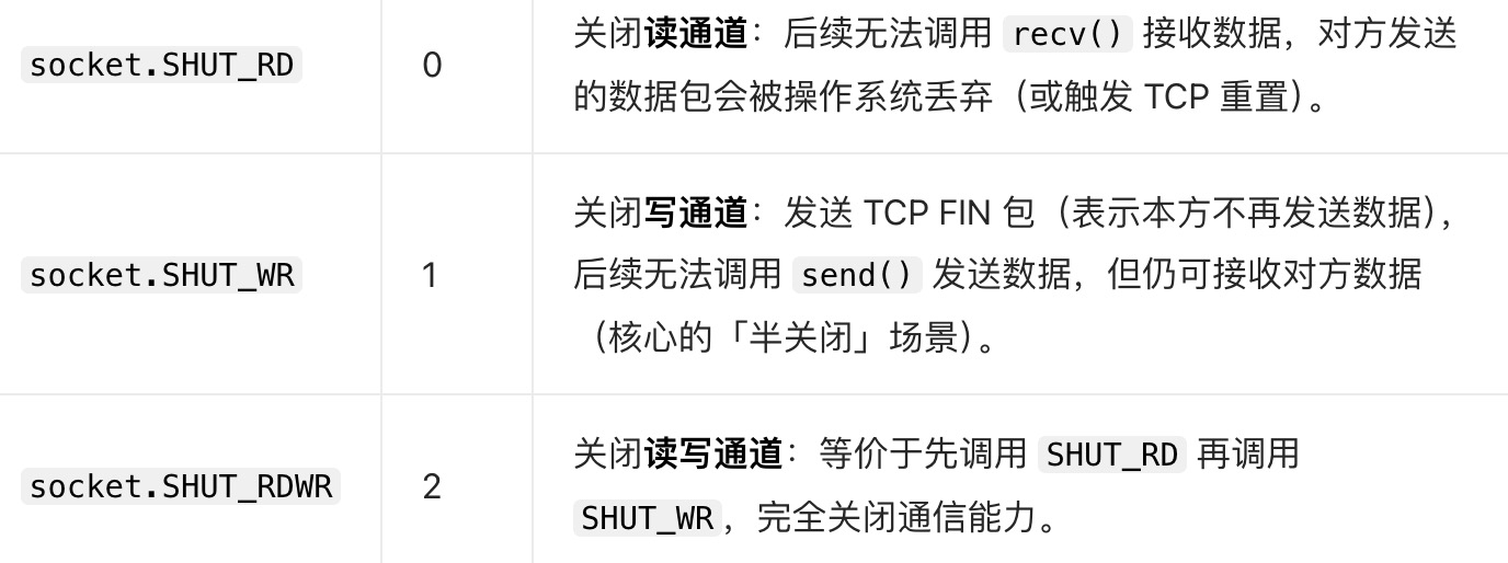 e.主动关闭套接字的读写通信通道的方法, 而非直接销毁套接字资源(先与Close调用)
