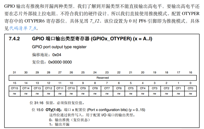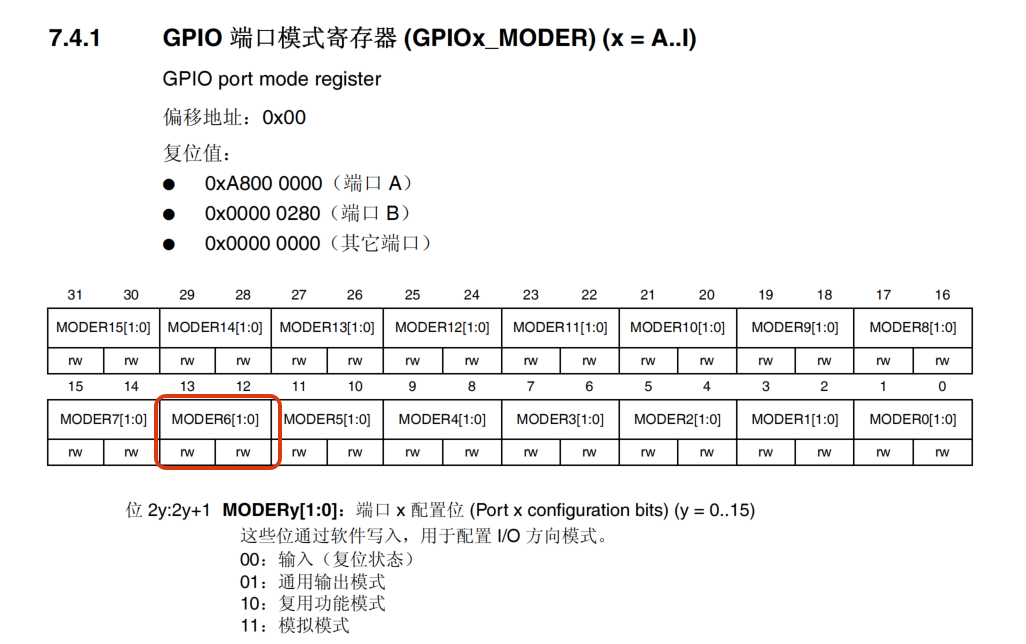 在代码中,我们先把 GPIOH MODER 寄存器的 MODER6 对应位清 0,然后再向它赋值"01",从而使 GPIOF6 引脚设置成输出模式。