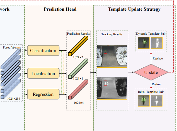- 虽然这不叫计算"损失函数"并进行反向传播(那是很耗时的),但它会计算一些置信度分数(类似分类得分 p_j)。如果分数太低,模型可能会判断当前跟踪不可靠,从而触发模板的恢复或替换。