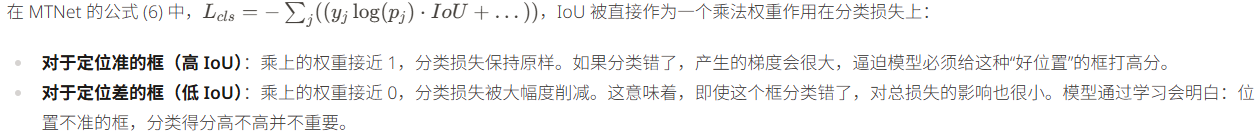 这种加权求和的方式使得模型在训练过程中能够同时兼顾三种能力:识标目标、画准边框以及自评质量。通过这三个维度的协同工作,MTNet 能够在复杂背景(如相似物体干扰)中挑选出定位最可靠的结果。