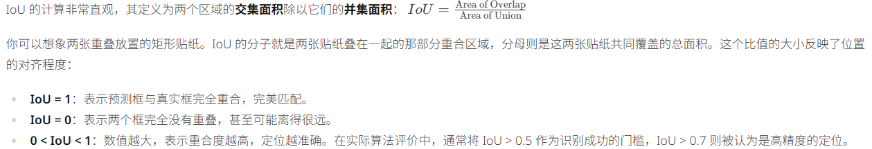 IoU (Intersection over Union,中文译为交并比)是计算机视觉中衡量两个形状(通常是目标边界框)重叠程度的最常用指标。在目标跟踪和检测任务中,它被用来量化"模型预测的位置"与"真实标注的位置"之间的吻合度。