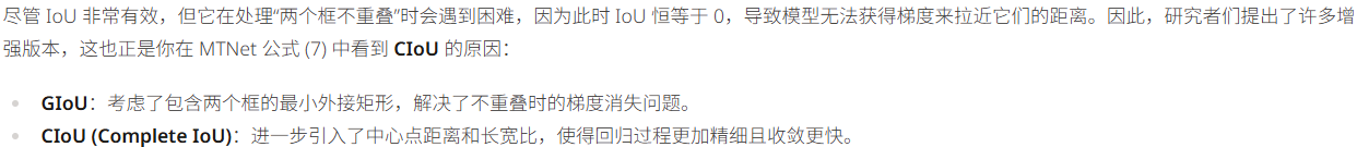 传统的像素级误差(如L_1损失)有时无法反映真实的重合效果。例如,两个面积很大的框即使中心点离得不远,其重合效果也可能很差;而 IoU 具有尺度无关性,无论目标大小如何,IoU 始终能客观地反映两者的相对重叠质量。在 MTNet 的公式 (6) 和 (8) 中,IoU 就被用作关键的监督信号,指导模型不仅要找对类别,更要画准边框。