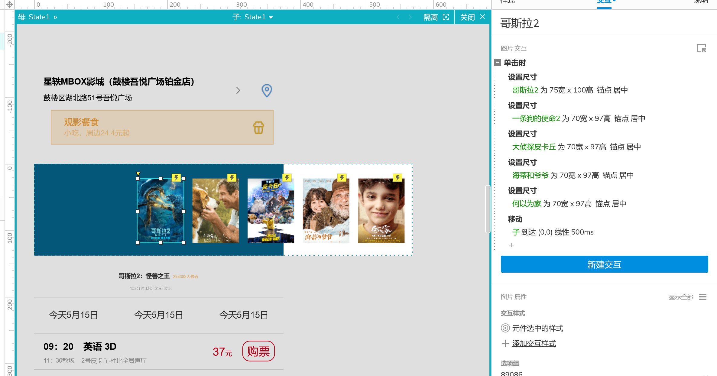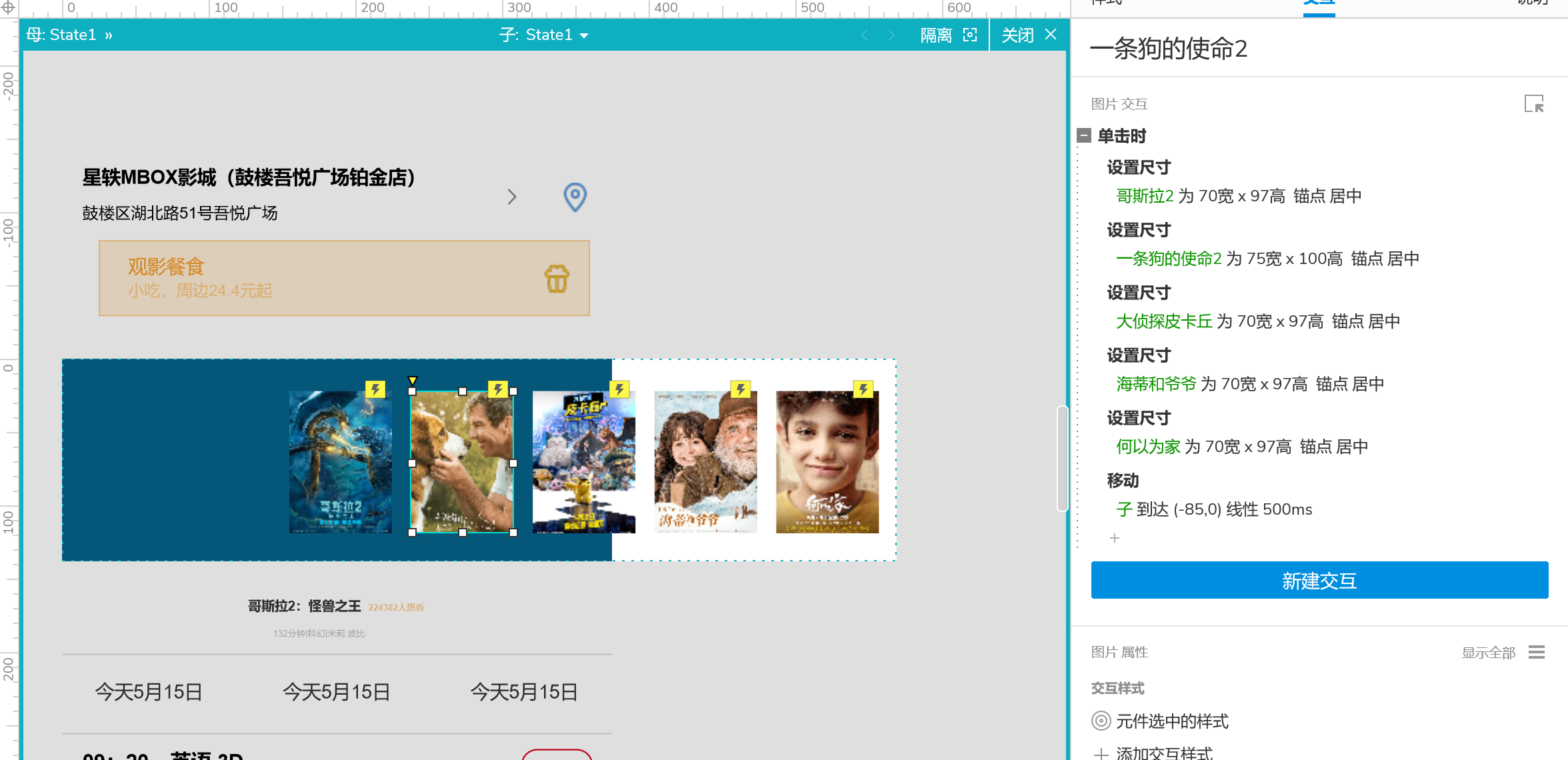 4、设置图片轮盘式交互:点击对应海报对应海报放大,对应海报移动到底部指针位置,【子】动态面板根据点击不同海报移动,当选中第二次海报时【子】动态面板移动(-85,0)其余海报根据-85为区间依次往后。