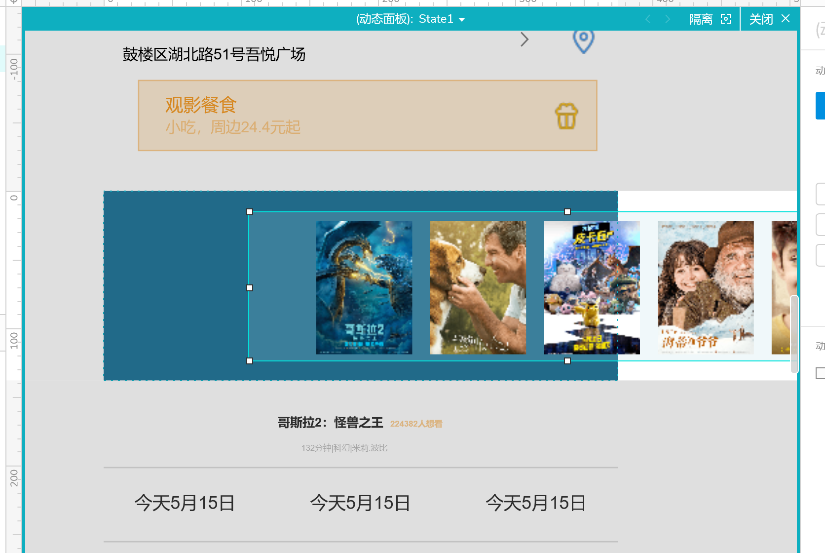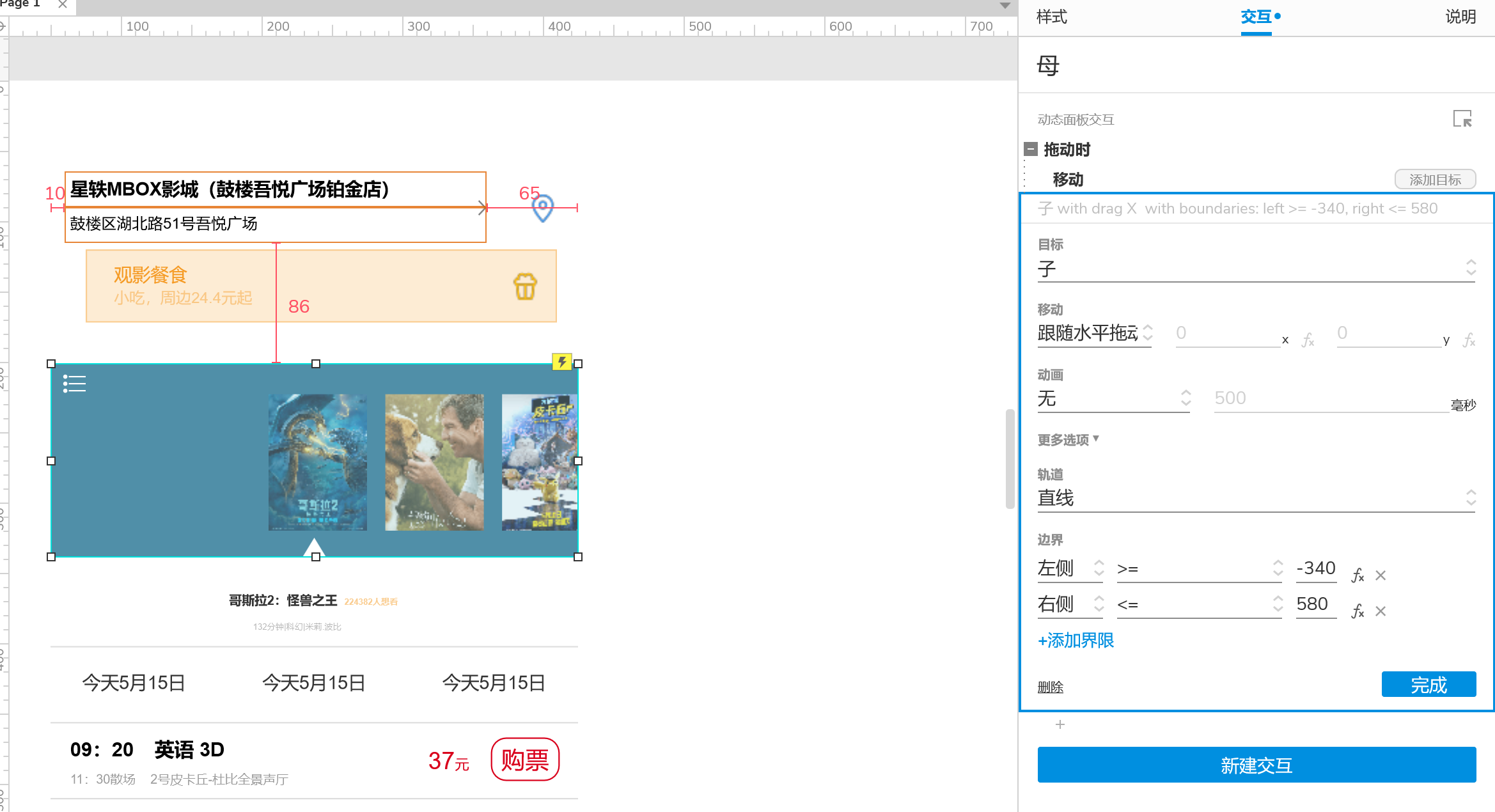 3、设置图片轮盘式滚动:【母】动态面板设置交互,拖动,水平移动,并设置移动范围。确保【子】动态面板中的电影海报可以水平移动。