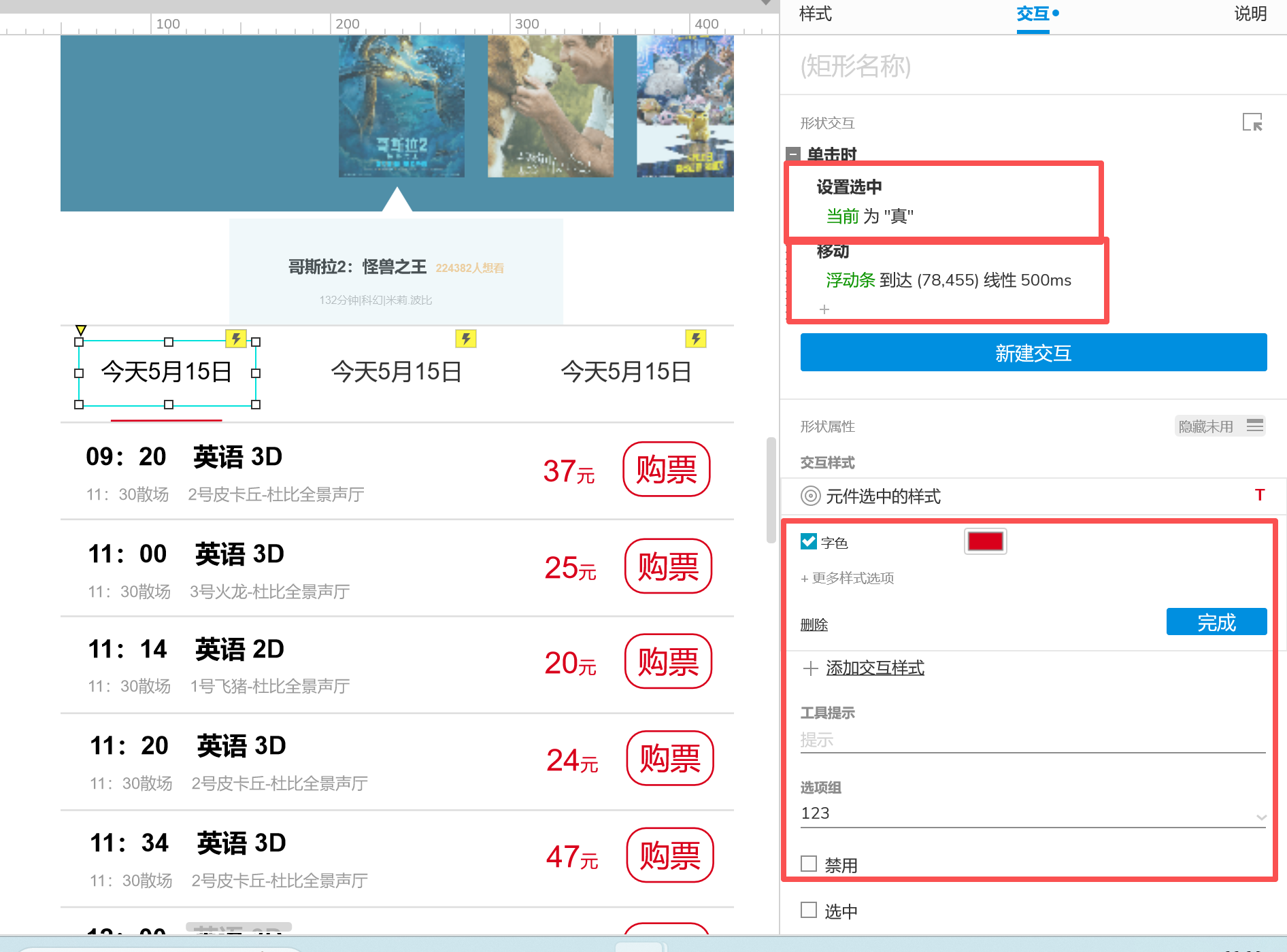 7、观影日期选中的交互,在观影日期下方新增浮动条,当选中不同日期时浮动条随之移动,当选中对应日期元件时对应日期变为红色。单机交互中需要加入"设置选中"下放字段设置交互设置选中时字段为红色,并加入选项组,加入选项组三组日期选中时的颜色才能为互斥的。