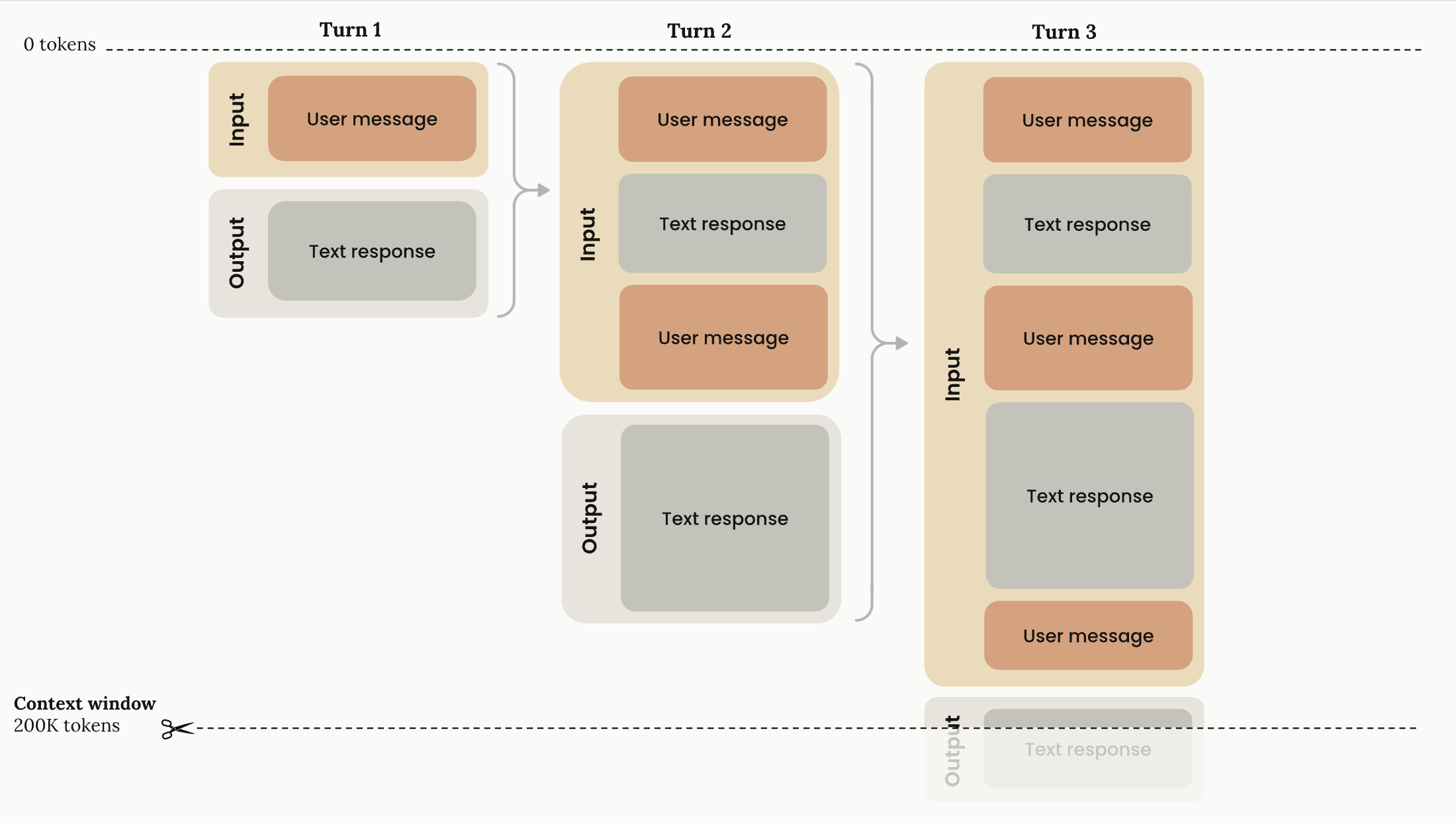 - 渐进式令牌累积: 随着对话在轮次中推进,每条用户消息和助手响应都在上下文窗口内累积。之前的轮次完全保留。