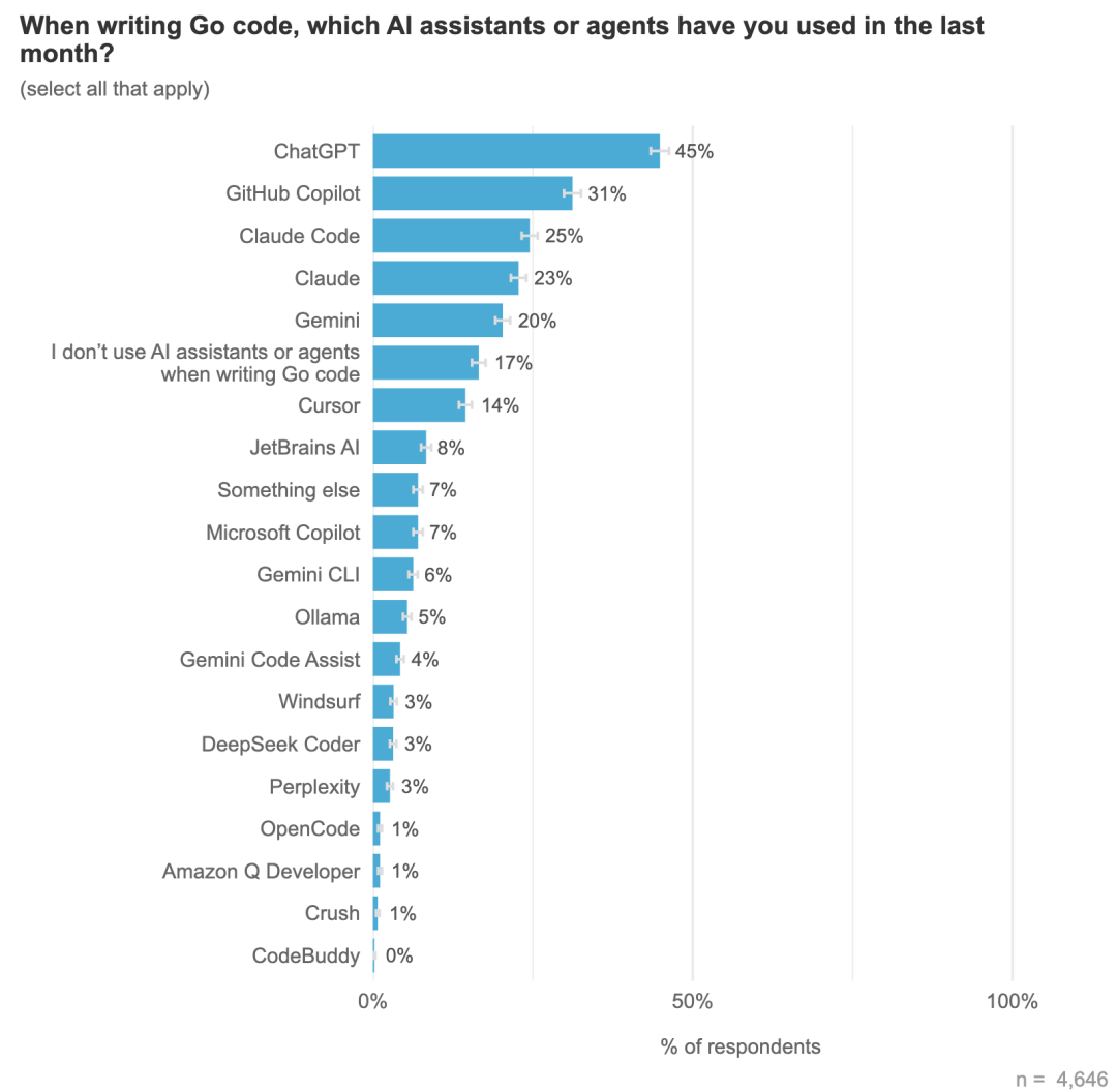 开发者的态度 :53% 的 Gopher 每天都在使用 AI 辅助编程工具。