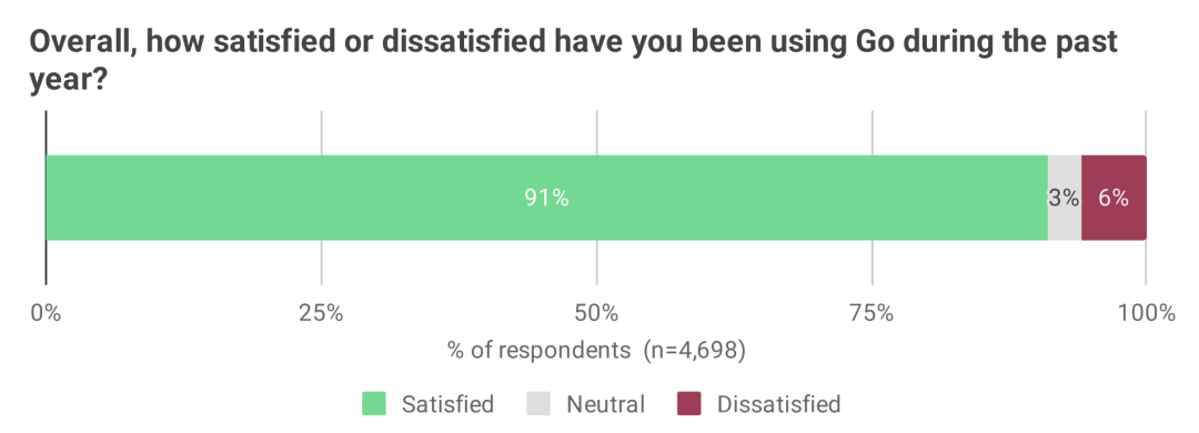 Go 的核心竞争力依然坚挺:91% 的开发者对使用 Go 感到满意,其中"非常满意"的比例高达近 2/3。这一数据自 2019 年以来一直保持极高水平。