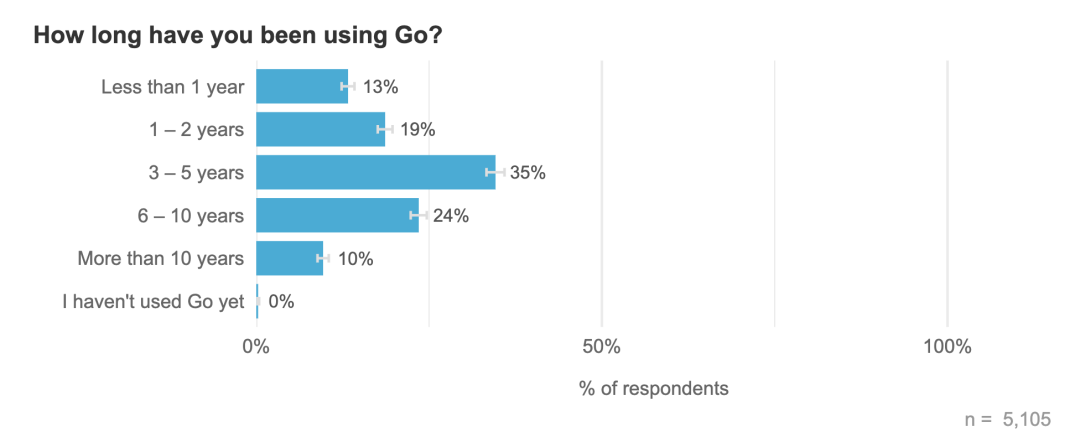 经验丰富 :75% 的开发者拥有 6 年以上的职业编程经验。更有意思的是,81% 的人表示他们的职业经验长于 Go 经验。这意味着绝大多数 Gopher 都是从其他语言(如 Java, Python)"转行"而来的。