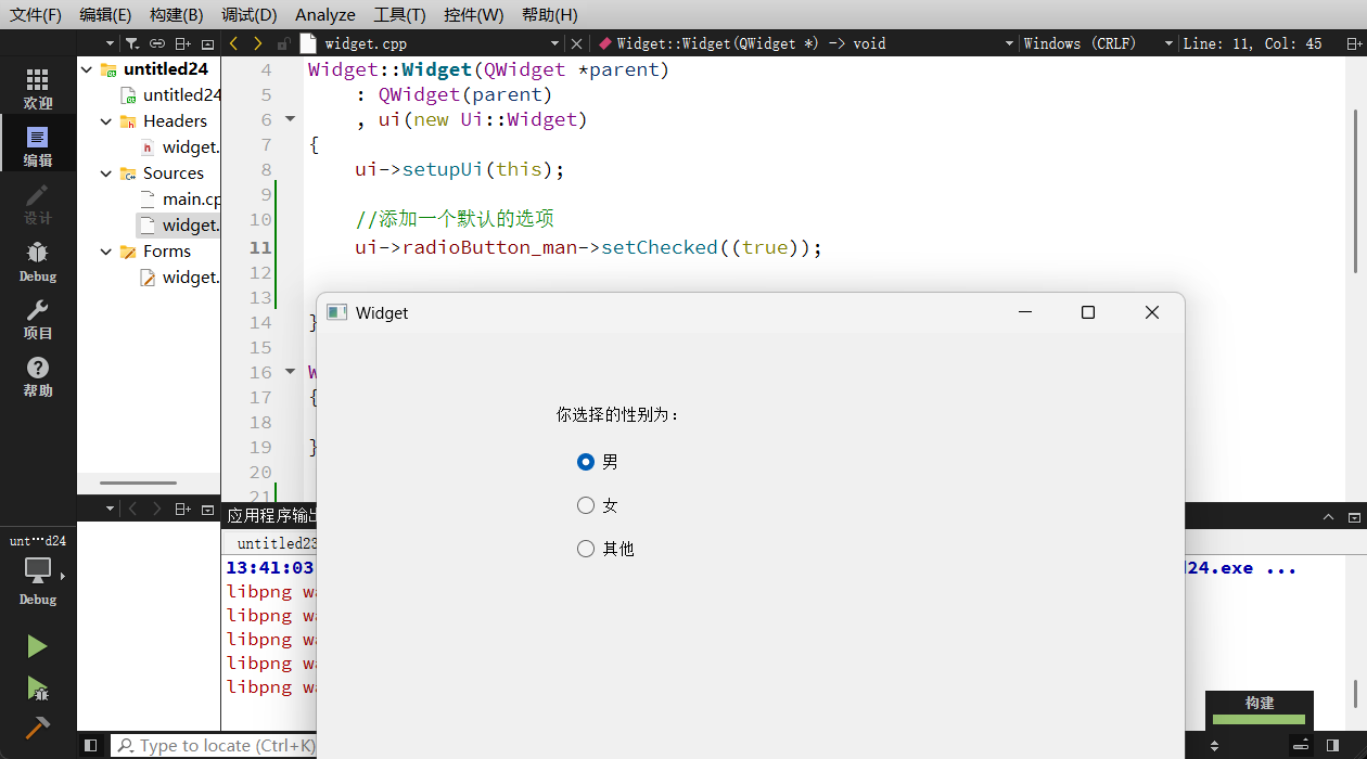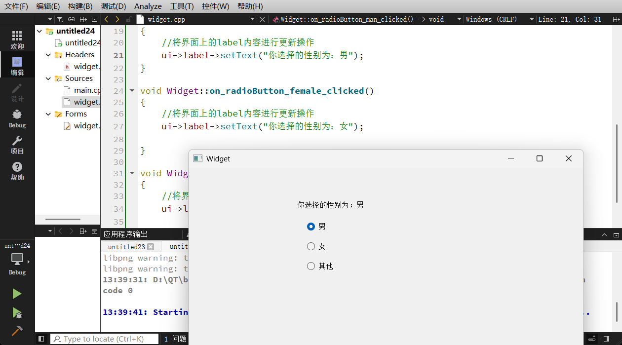 在界面中拖入三个单选按钮(例如:男、女、其他),并添加一个Label用于显示结果。