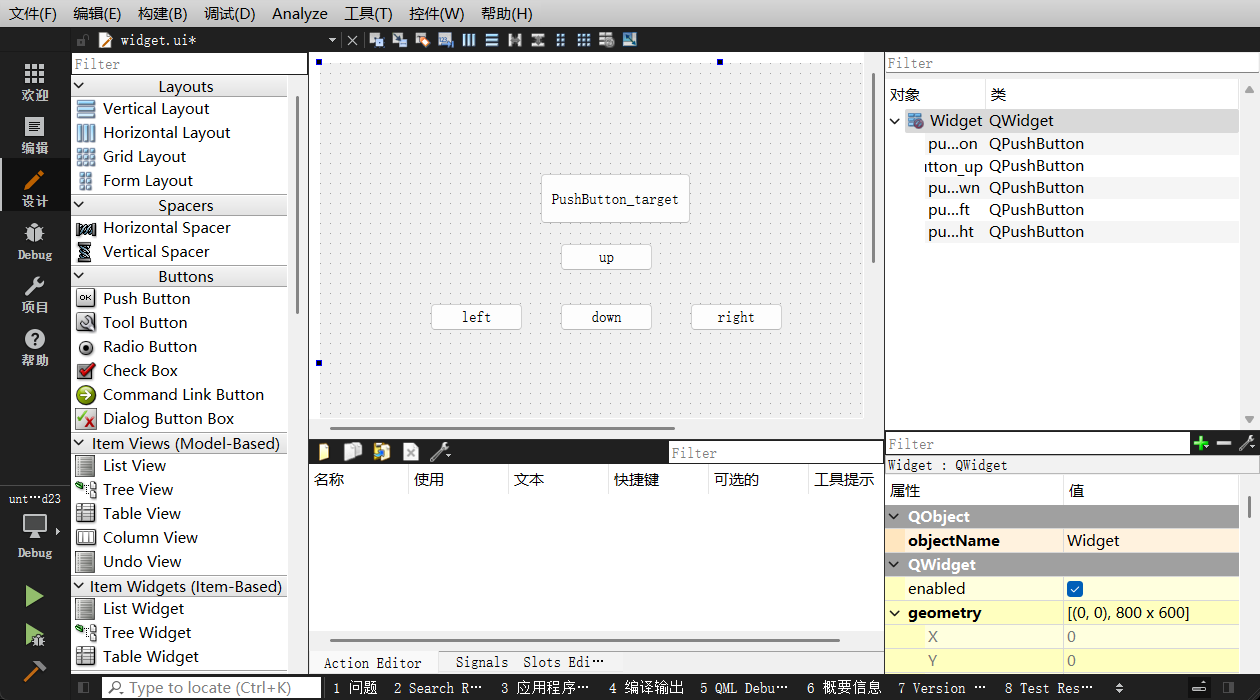 在UI设计器中放置五个按钮:中间为目标按钮(Target),周围环绕四个方向控制按钮。