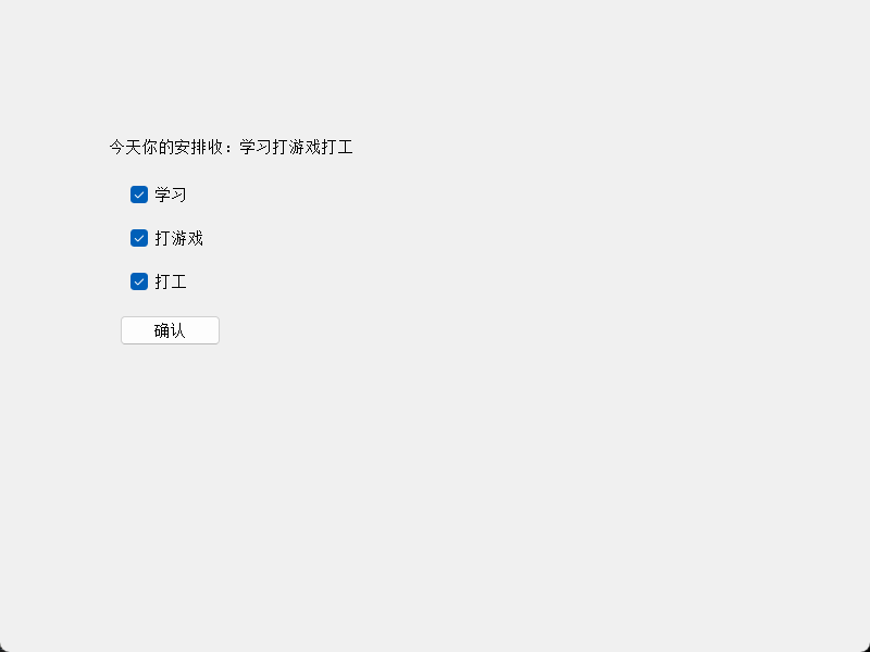 在日程安排的案例中,界面包含三个复选框(学习、游戏、工作)和一个确认按钮。业务逻辑是:用户勾选若干项后,点击确认,程序读取所有被选中的状态并拼接成字符串显示。