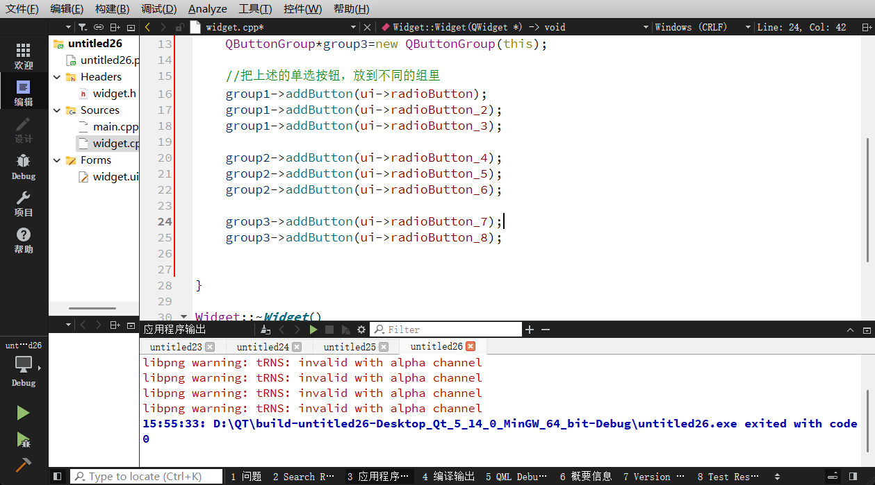 在测试界面中放置四个按钮,分别连接不同信号进行调试。