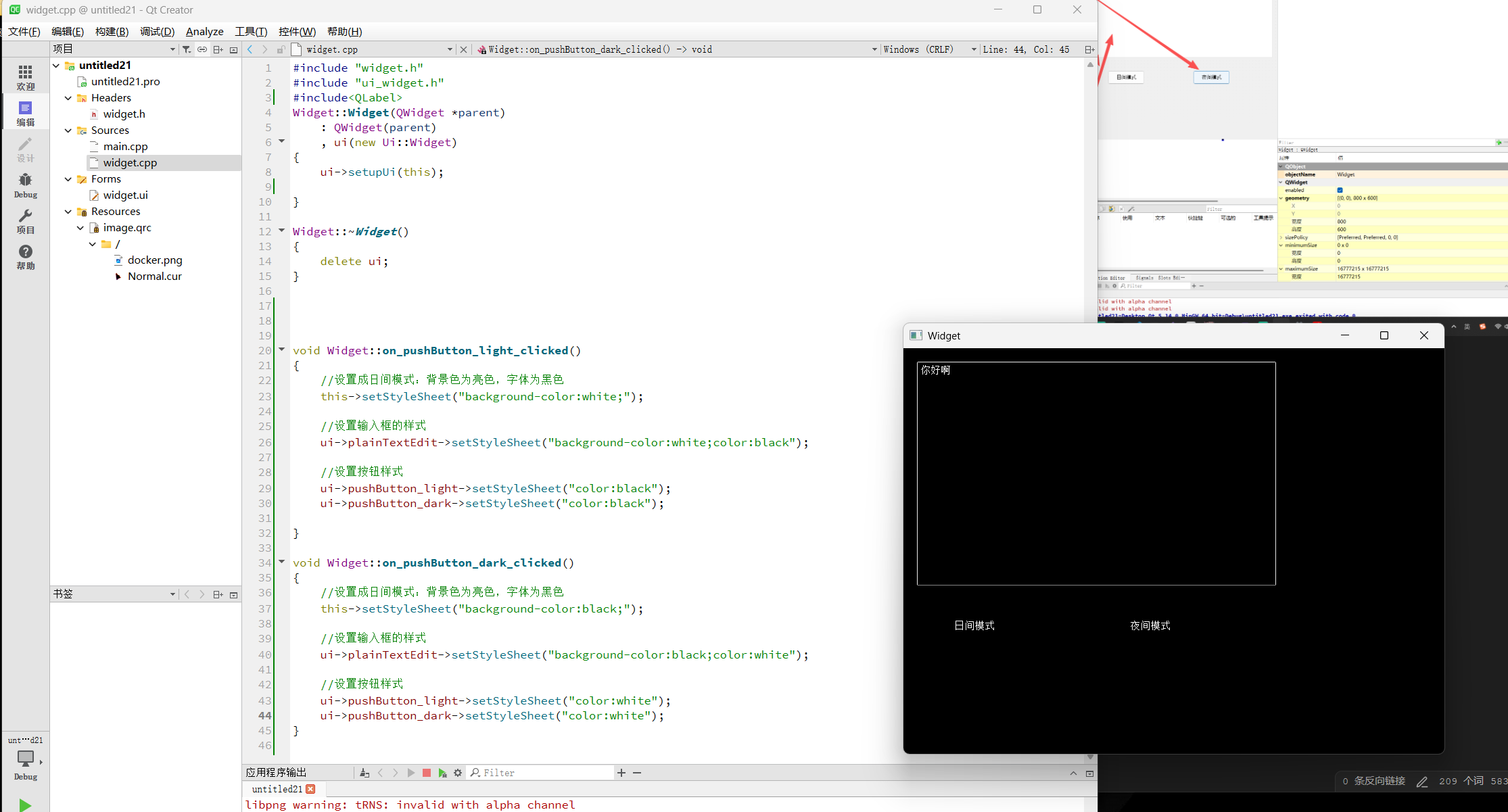除静态设置外,QSS更强大的功能在于通过C++代码动态加载或修改样式,从而实现如"主题切换"等高级功能。以下案例展示了如何通过按钮触发界面的日间模式与夜间模式切换。