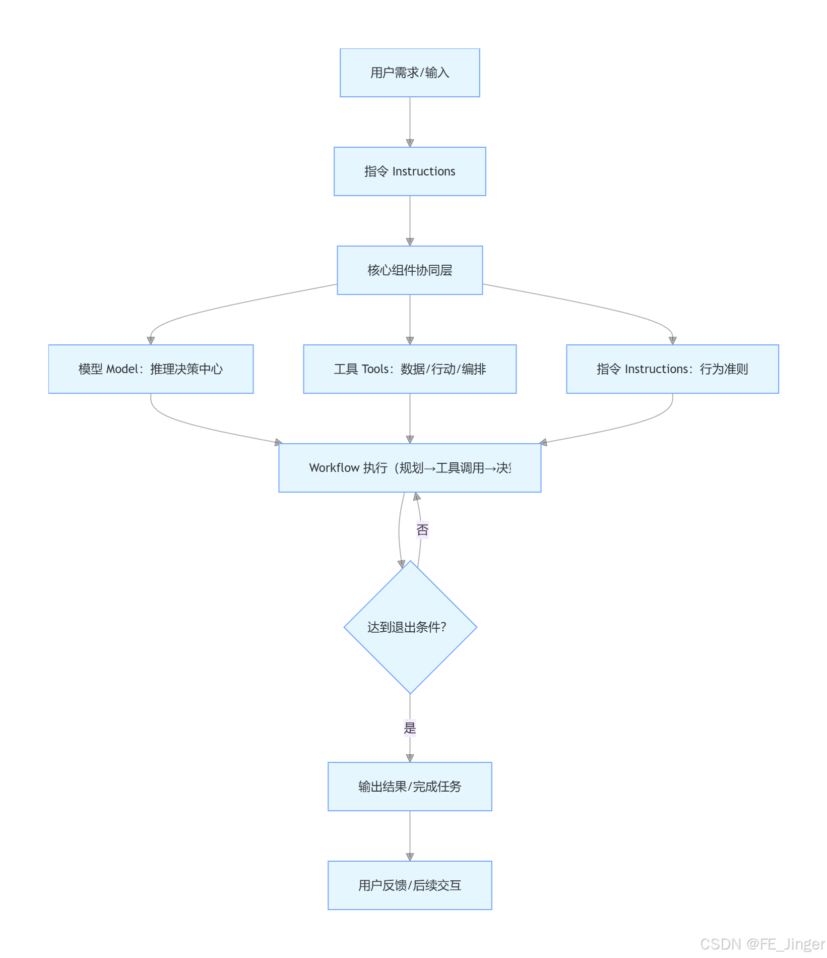 - 核心协同层:模型、工具、指令三者联动,模型负责"思考",工具负责"执行",指令负责"约束";
