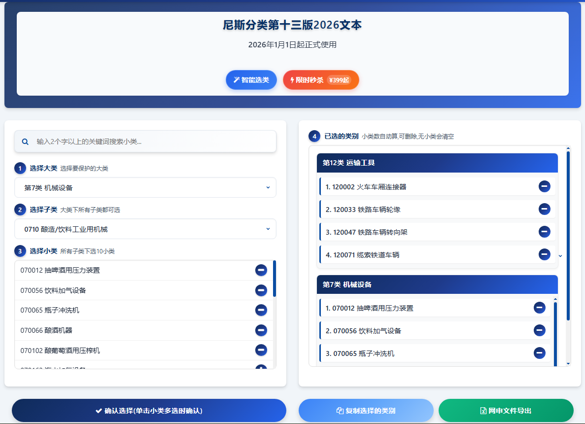 2026年1月1日,《商标注册用商品和服务国际分类》(尼斯分类)第十三版已正式生效。本次更新不仅是项目的简单增减,更是对类别结构、新兴领域的系统性重构。对于企业而言,准确理解全新的 45个大类,是进行商标精准布局、规避风险的基石。与此同时,面对更精细的分类体系,传统的选类方式已显吃力,利用如倾企商标选类工具2.0这样的智能化解决方案,正成为提升效率与准确性的关键。