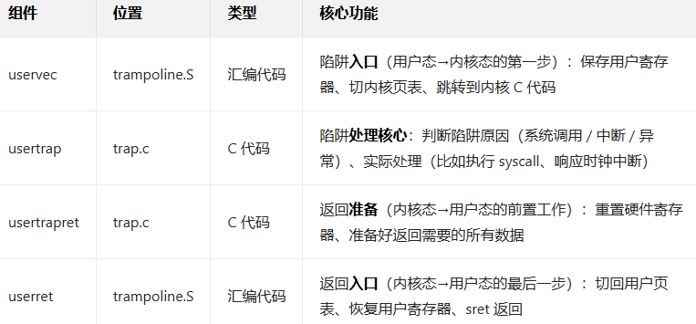 用户态运行时,satp 指向用户页表(这个页表只映射用户自己的内存,不映射内核代码 / 数据),但陷阱最终需要内核来处理(用户态不能自己处理陷阱,否则会有安全问题)。 矛盾点在于陷阱后还在用用户页表,怎么才能执行内核的处理代码?xv6 的整个处理流程,本质就是绕开硬件约束,安全解决这个矛盾,全程围绕 "先切到内核页表让内核处理,再安全切回用户页表返回" 展开。