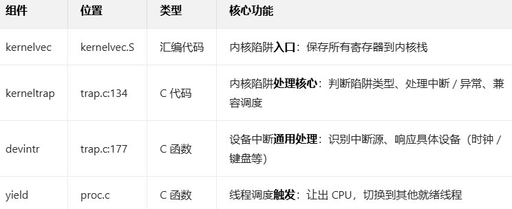 步骤5:跳回kernelvec(汇编)→ 从内核栈恢复寄存器 → sret返回被中断的内核代码