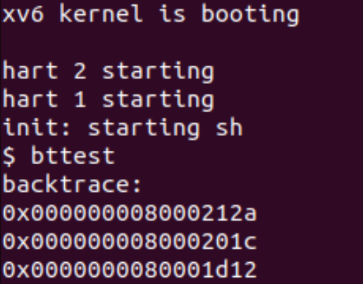 2.栈帧布局图。注意返回地址位于栈帧帧指针的固定偏移(-8)位置,并且保存的帧指针位于帧指针的固定偏移(-16)位置,接下来实现backtrace,栈页面的顶部和底部使用PGROUNDDOWN(fp)和PGROUNDUP(fp)进行计算,通过这个看fp是否超过