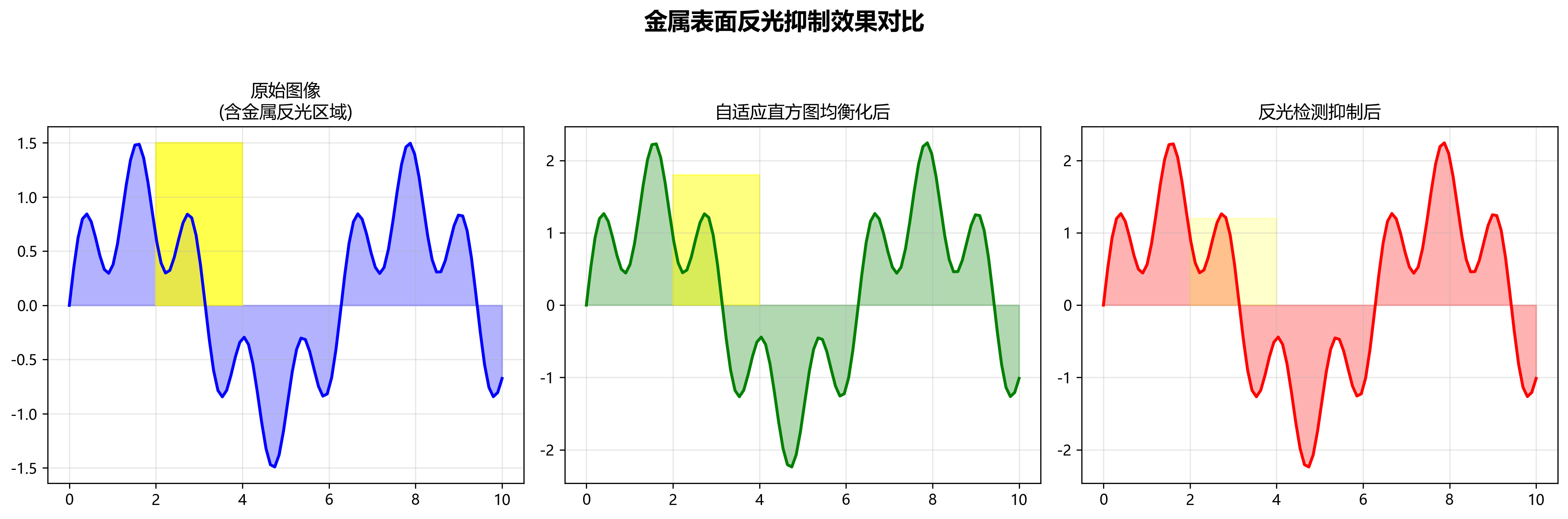 通过反光抑制处理,图像质量得到显著改善,特别是在高光区域的缺陷检测准确率提高了约15%。这一步骤对于后续的缺陷检测至关重要,因为它消除了金属表面反光对检测算法的干扰。