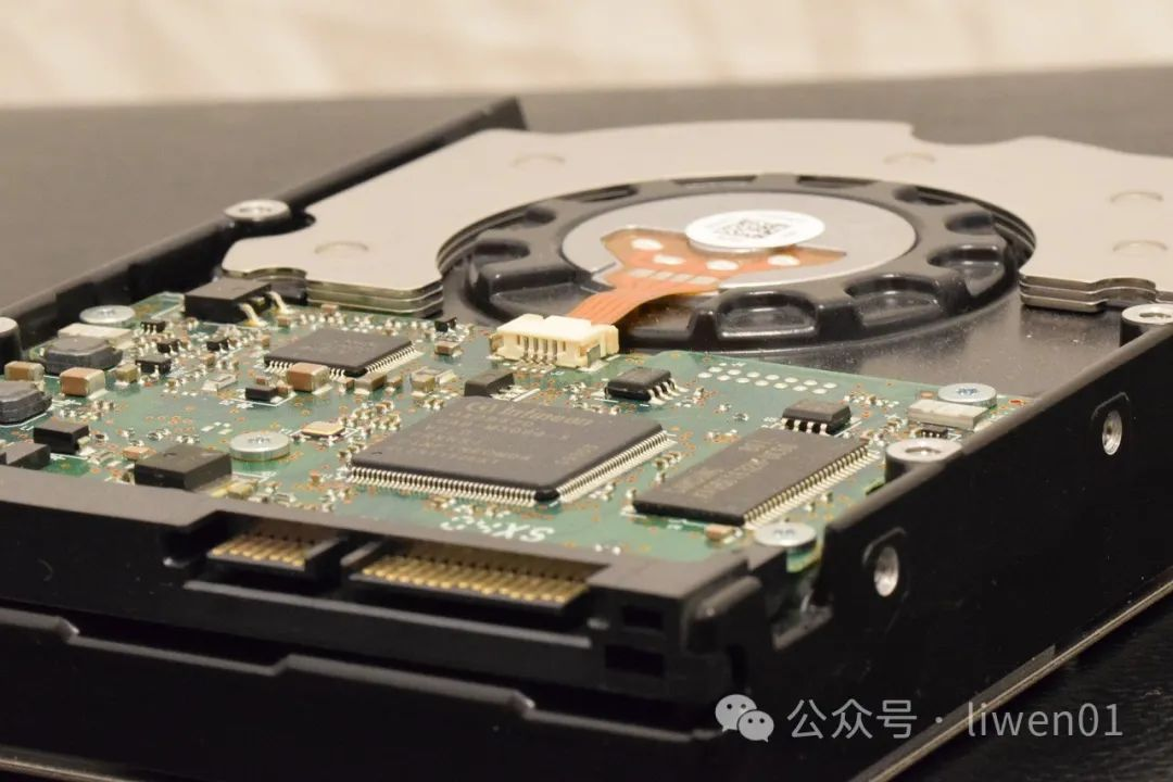 我们从外部看,一个机械硬盘上有:主控芯片、高速缓存、电源接口、主从设置电路、数据接口、控制电路板。