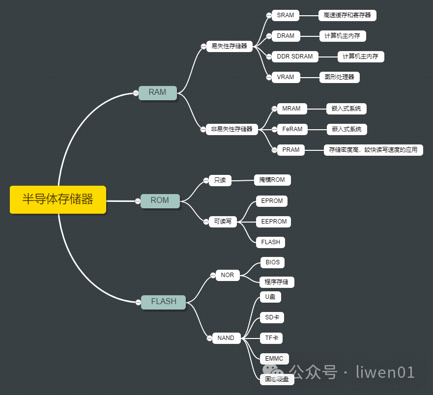 固态存储,也就是不依赖机械传动,直接使用半导体芯片为介质的一种存储。大的分类可以分为两种: RAM和ROM。