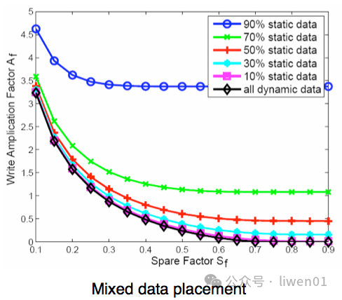 上面只是个假设,实际有垃圾回收策略的接入,不会是128倍这么大。下面是IBM Zurich Research Laboratory做的研究,实际证明写放大与空闲净块关系极大