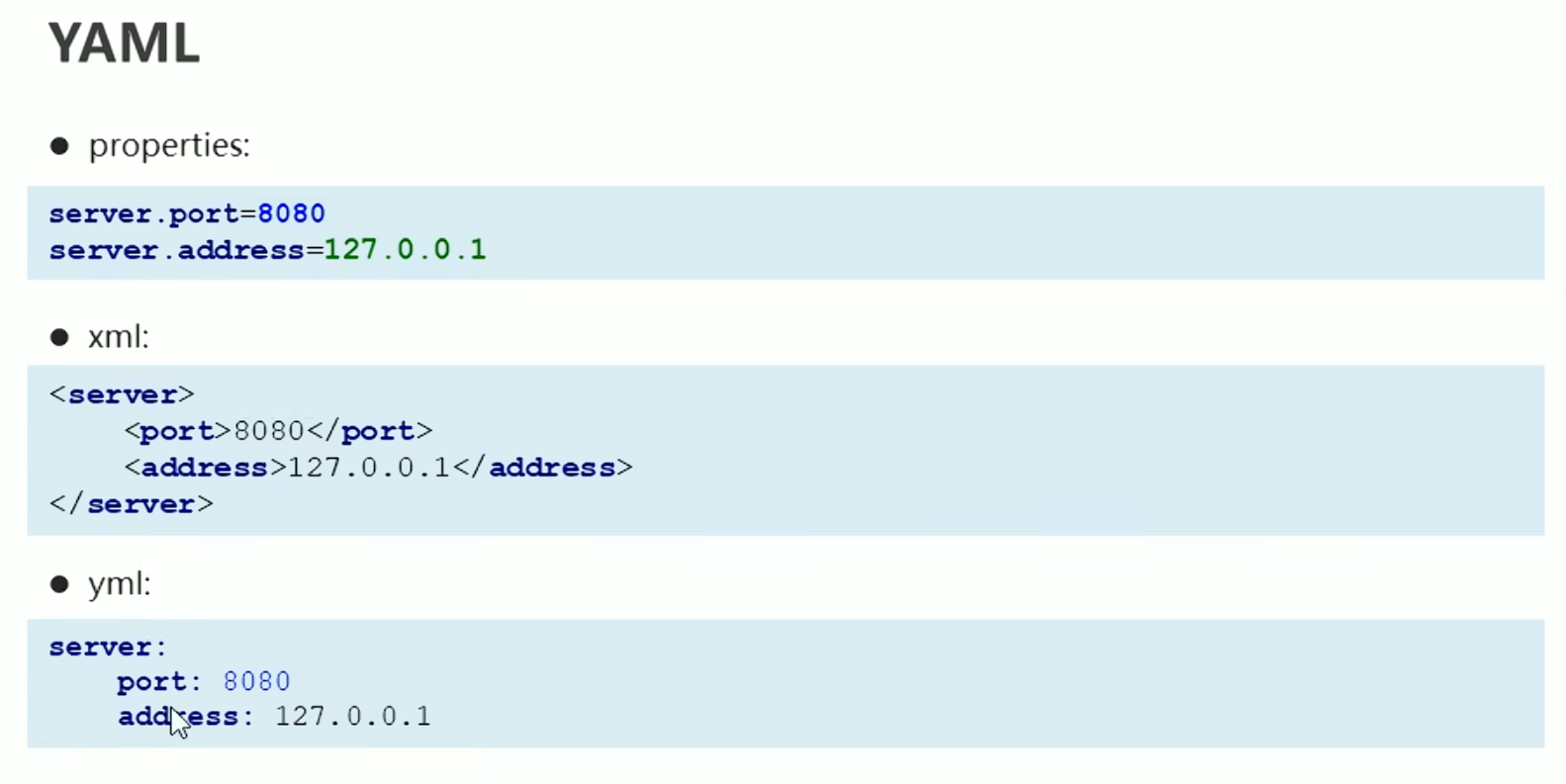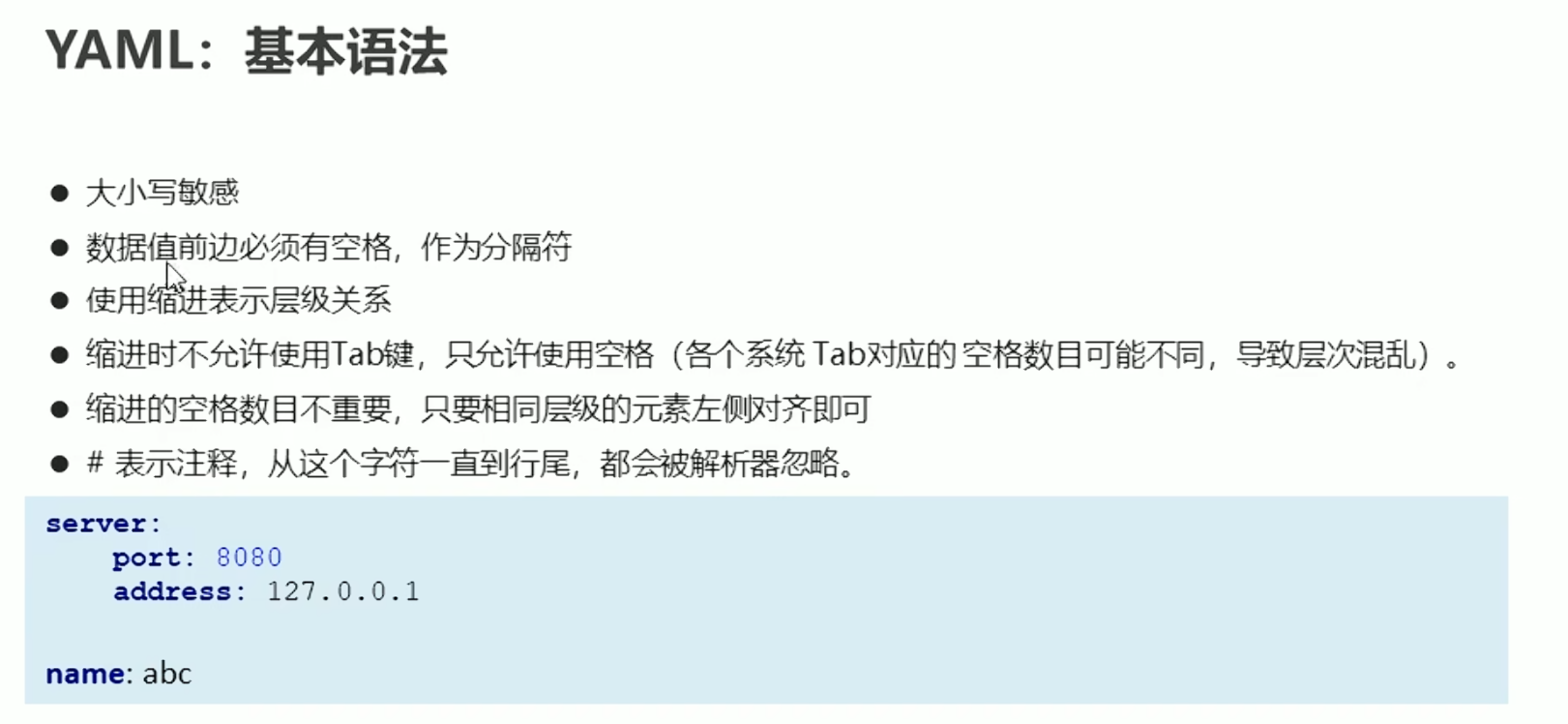 server.port: 8082:指定项目启动后占用的端口号(默认是 8080)。✅ 为什么要写:如果你的电脑上同时运行多个 Spring Boot 项目,8080 端口可能被占用,改个端口(比如 8082)就能避免冲突。server.servlet.context-path: /boot:指定项目的访问根路径。✅ 为什么要写:默认访问路径是http://localhost:8082/,加了这个配置后,必须用http://localhost:8082/boot/才能访问项目接口,避免不同项目的接口路径冲突。- 注释里的 "必须带空格、有缩进":YAML 格式的规则 ------ 冒号后必须加空格,层级靠缩进(2 个空格)区分,这是 YAML 的语法要求,写错了配置会失效。
