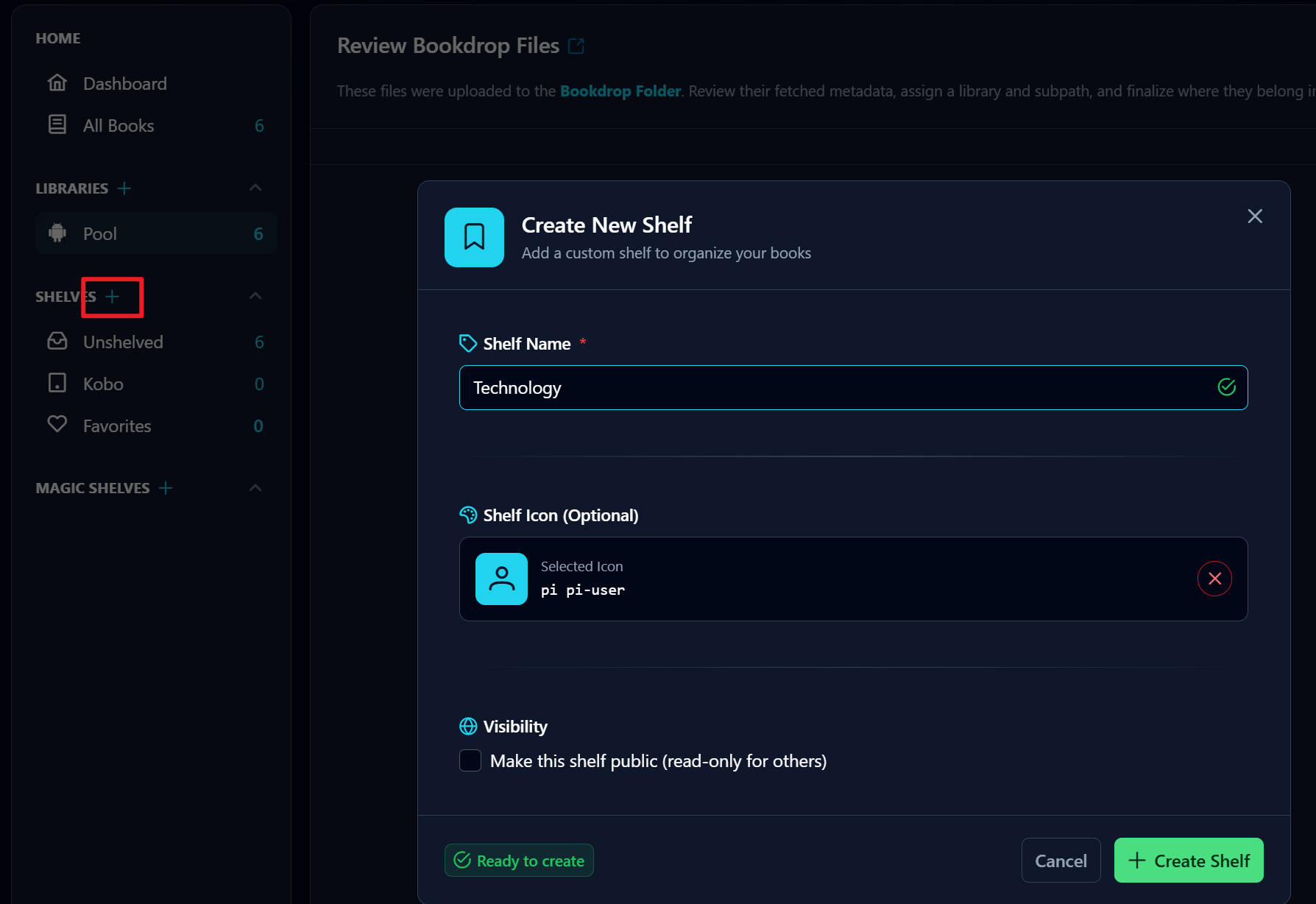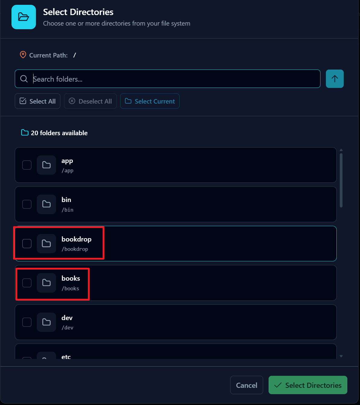 新建Library需要指定在存在哪个系统的文件夹。因为是使用的Docker镜像,我们只映射了这两个文件夹,所以就选book就行了。Library就是图书馆,一个就够用了。分类可以靠书架Shelf。另一个bookdrop文件夹,是支持扫描新加图书的位置。