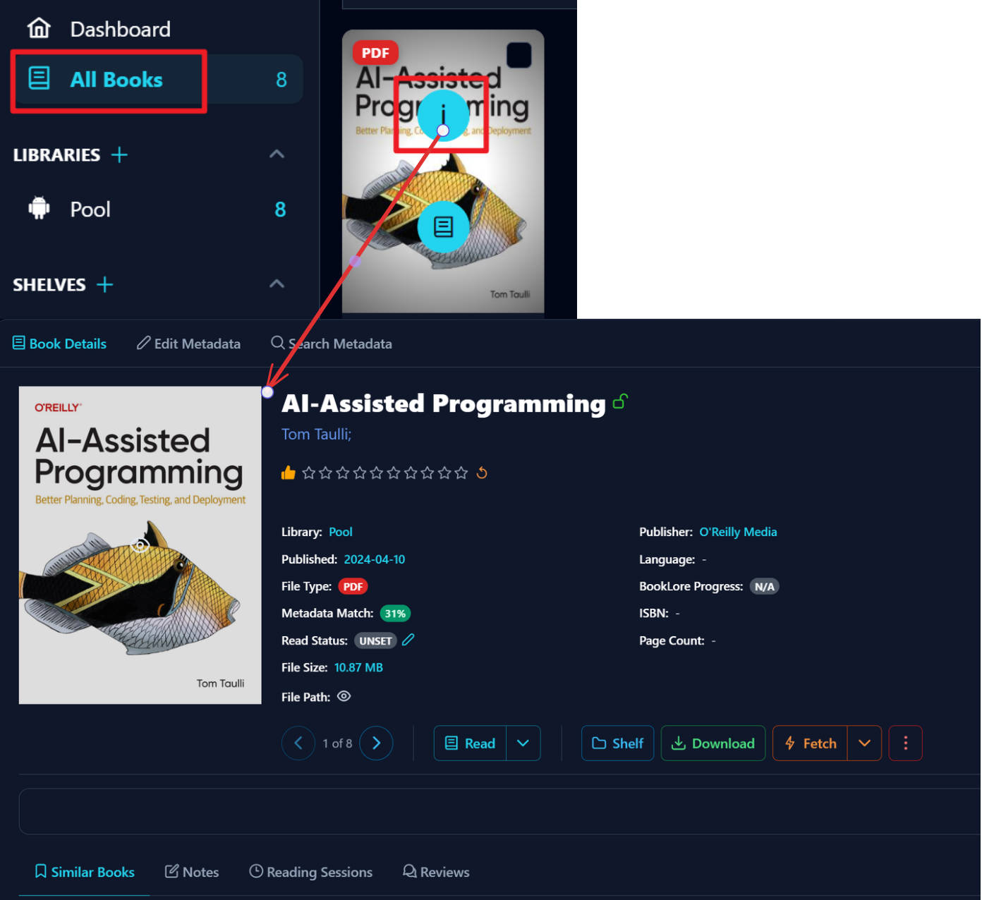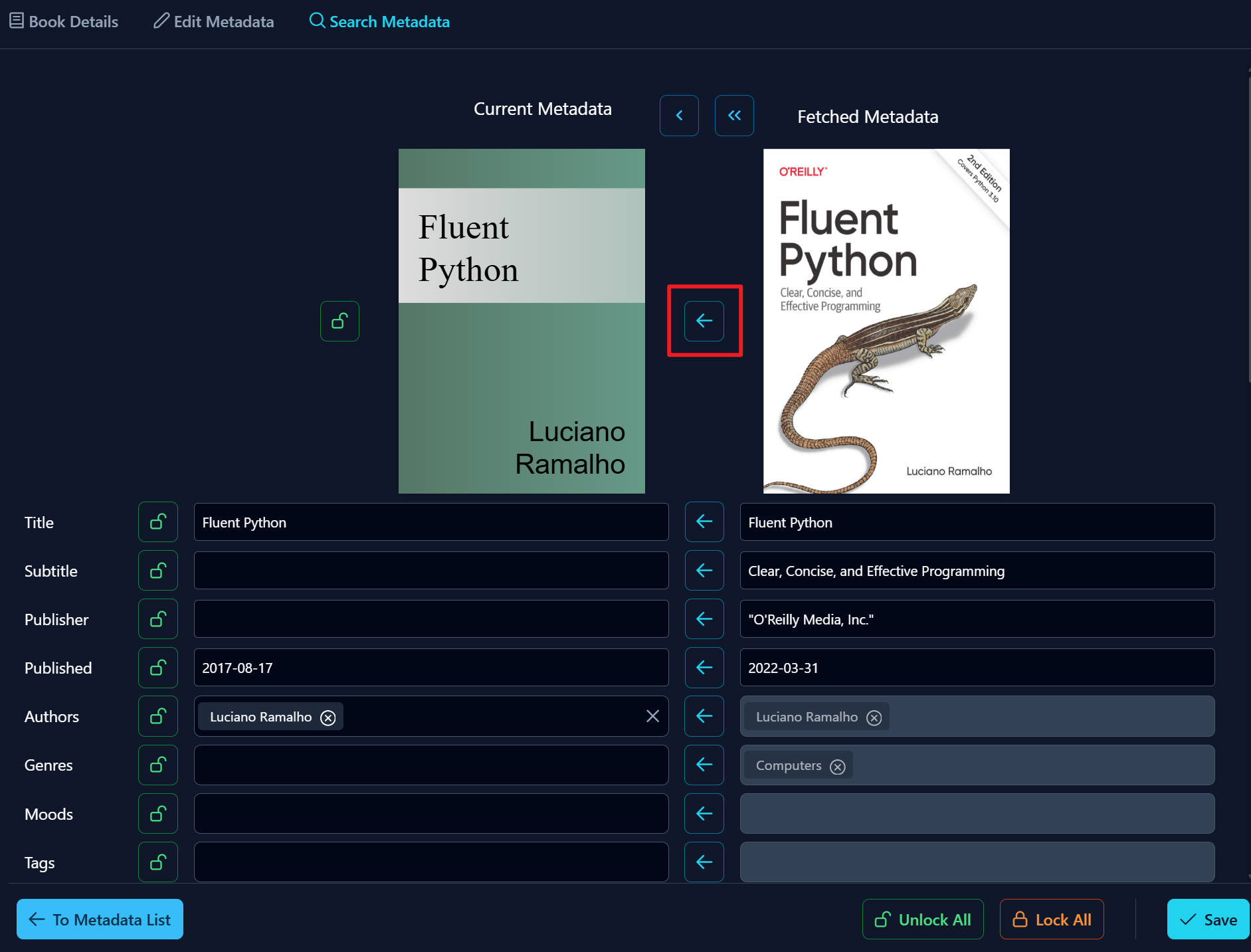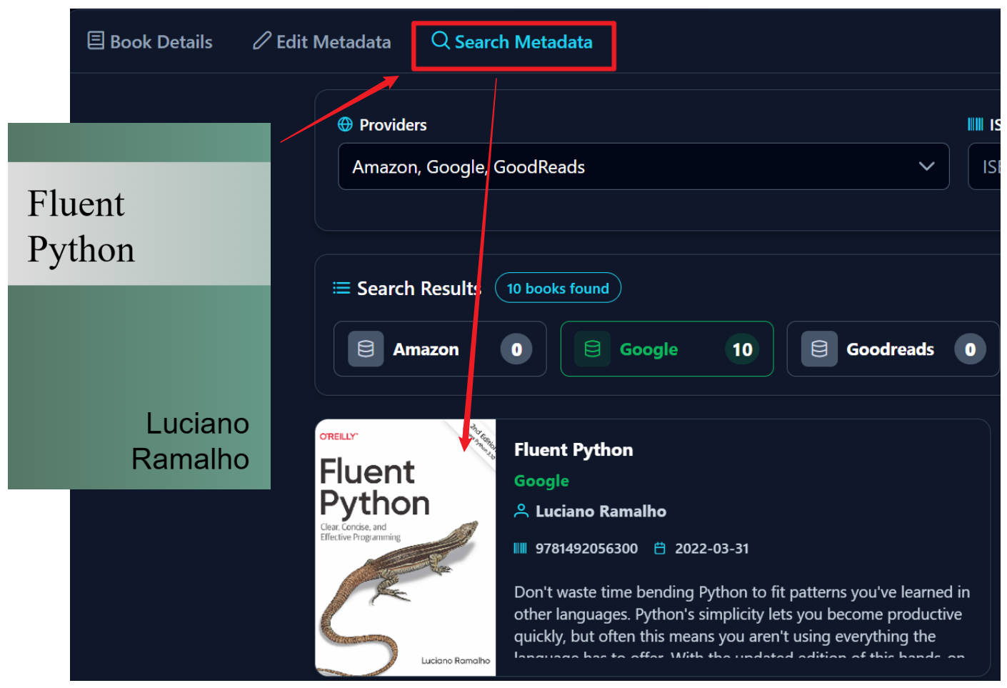 譬如这本书没有封面和详细信息,可以通过Search Metadata,单箭头来更新封面,双箭头更新详细信息,最后保存。
