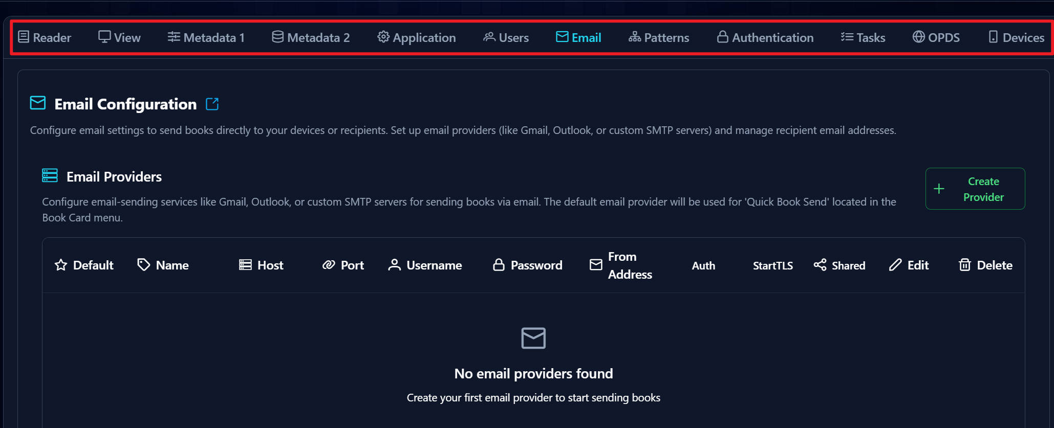有各种的设置,包括阅读器,详细信息,邮件,用户,认证,设备等。