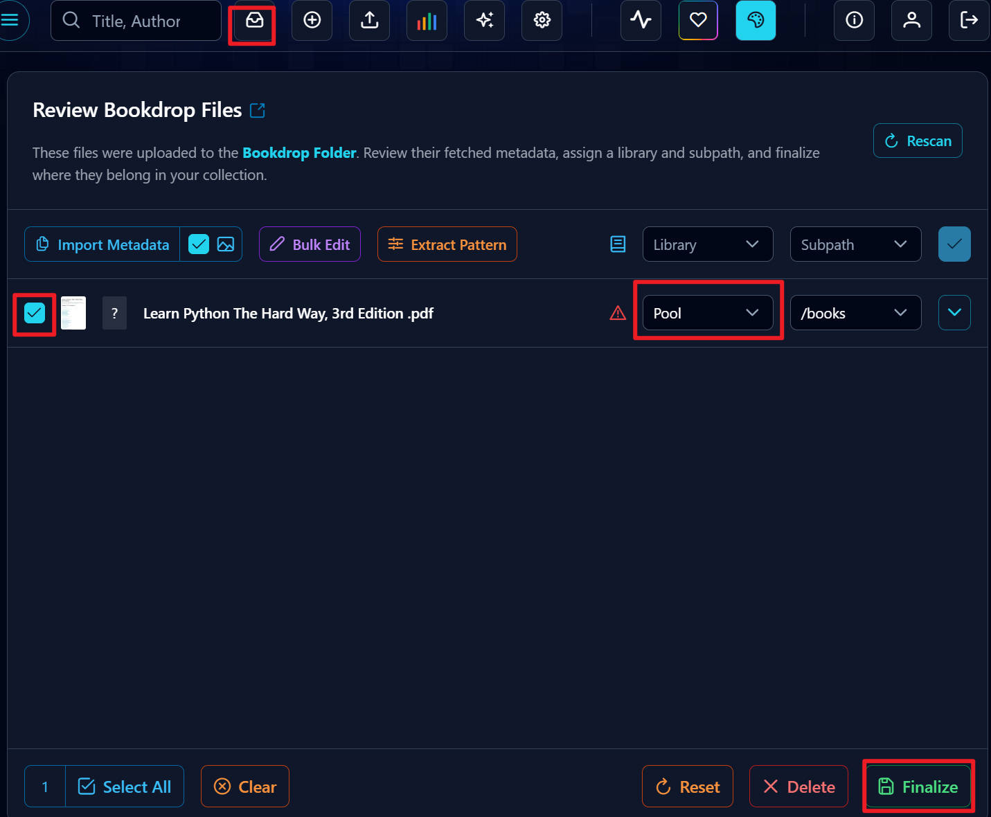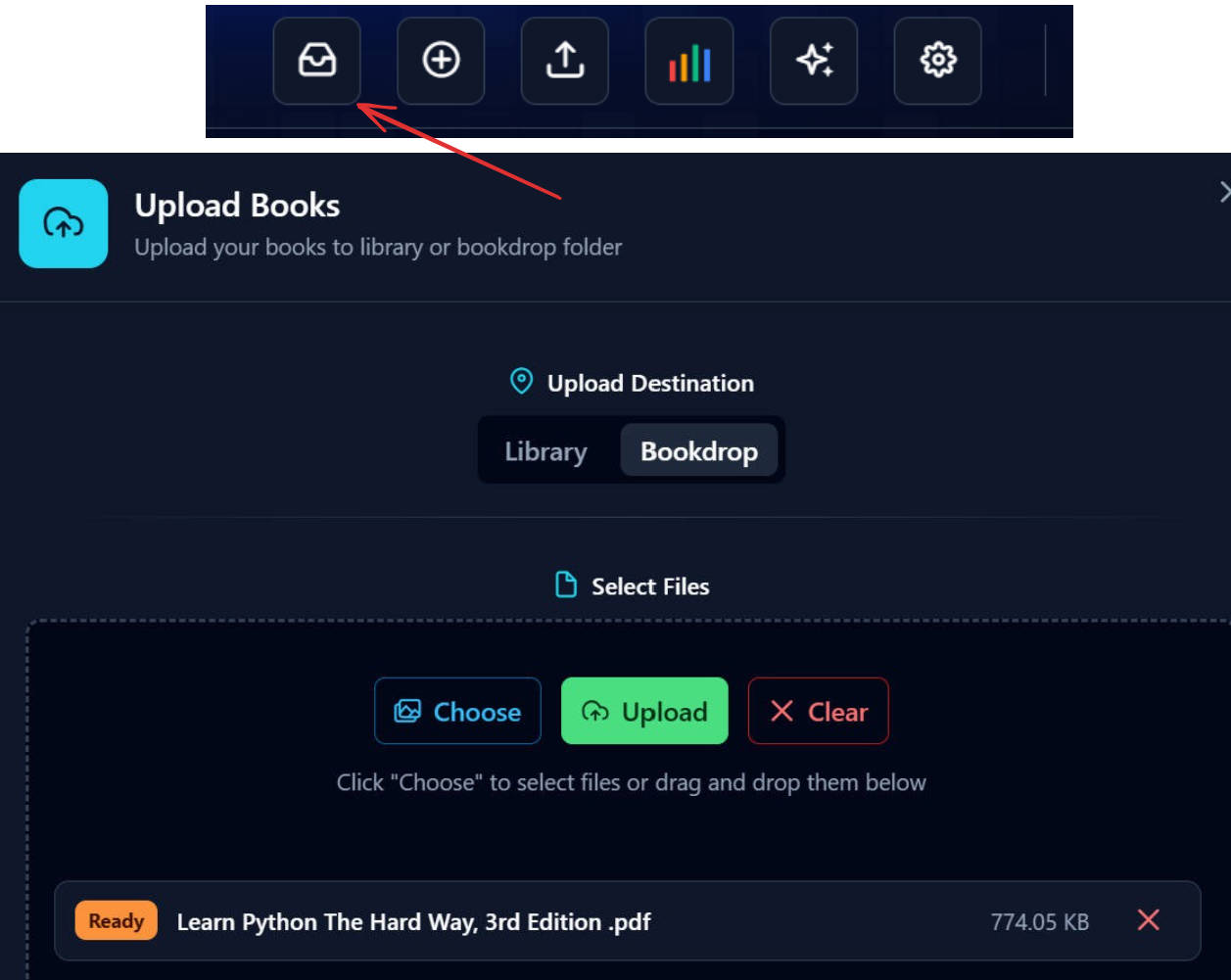 到这个Bookdrop区域,然后选择放到哪个Library里。对于一次上传多个文件,且需要放到不同的Library的情况下还是有用的。对于单Library的话,就更繁琐了。