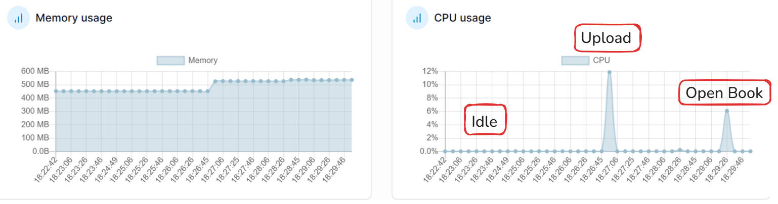 现在是只有我一个用户,空闲的时候,占用400多M的内存。上传文件和打开书籍时,CPU和内存的占用都会提高。再加上数据库,一个人用的多时候会用到将近700M的内存。对于2核2G的轻量服务器,也就算是刚好够用吧,毕竟还得有几个其它的服务。
