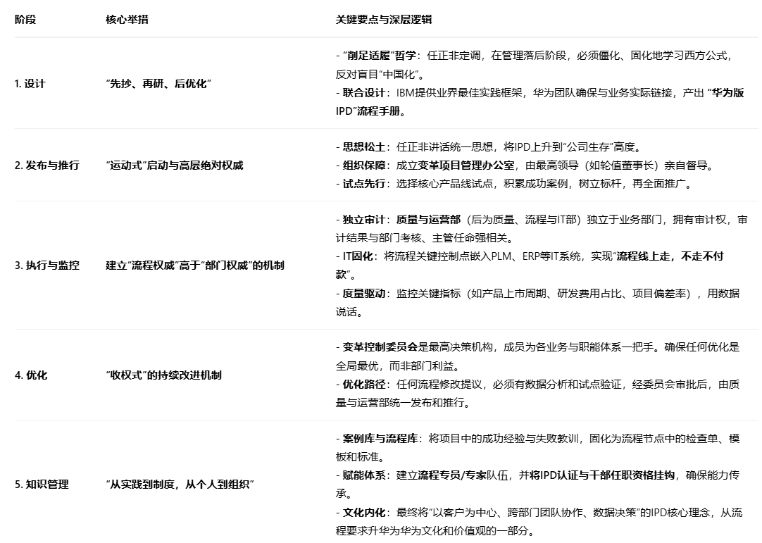 核心实践 :华为对IPD的管理,是 "先僵化,后优化,再固化" 的经典范例。