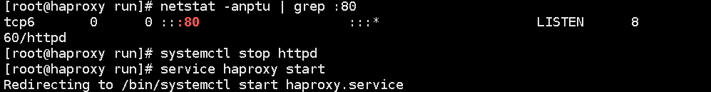 通过命令查看日志和端口状态信息,发现80端口被httpd占用,导致haproxy服务启动失败,所以停止httpd服务,再重启: