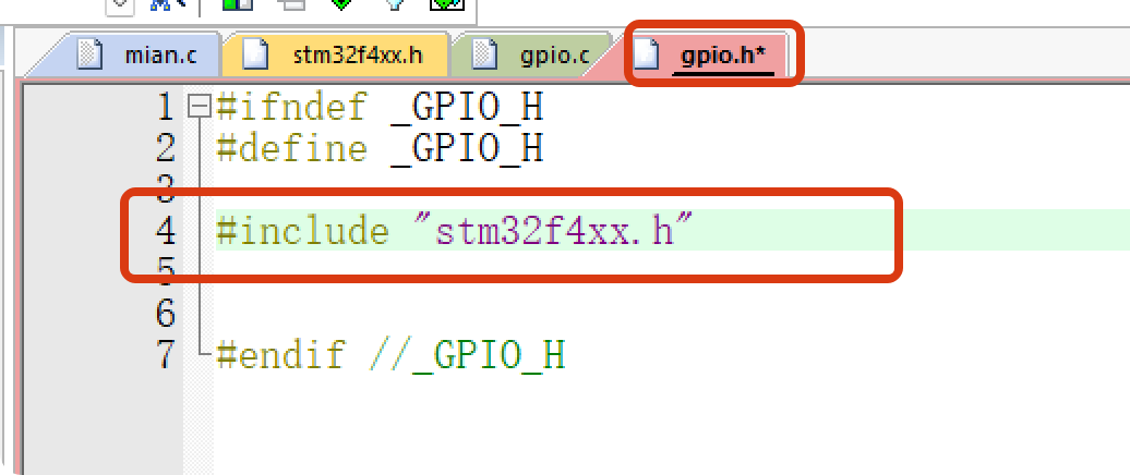 在gpio.c中一定会用到stm32f4xx.h中映射的各种寄存器,需在gpio.h中包含,所以说就是在.c中想用到哪个.h文件,在自己的.h文件中包含这个.h就行了