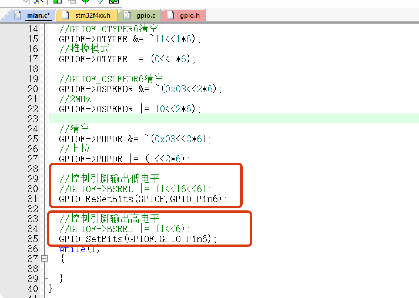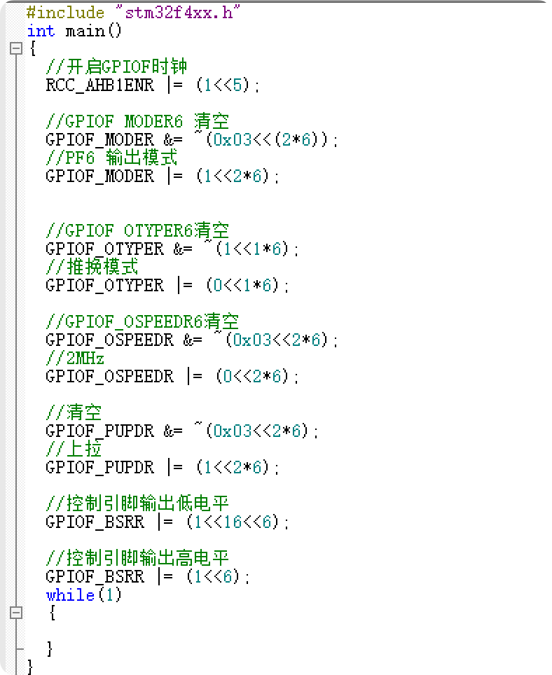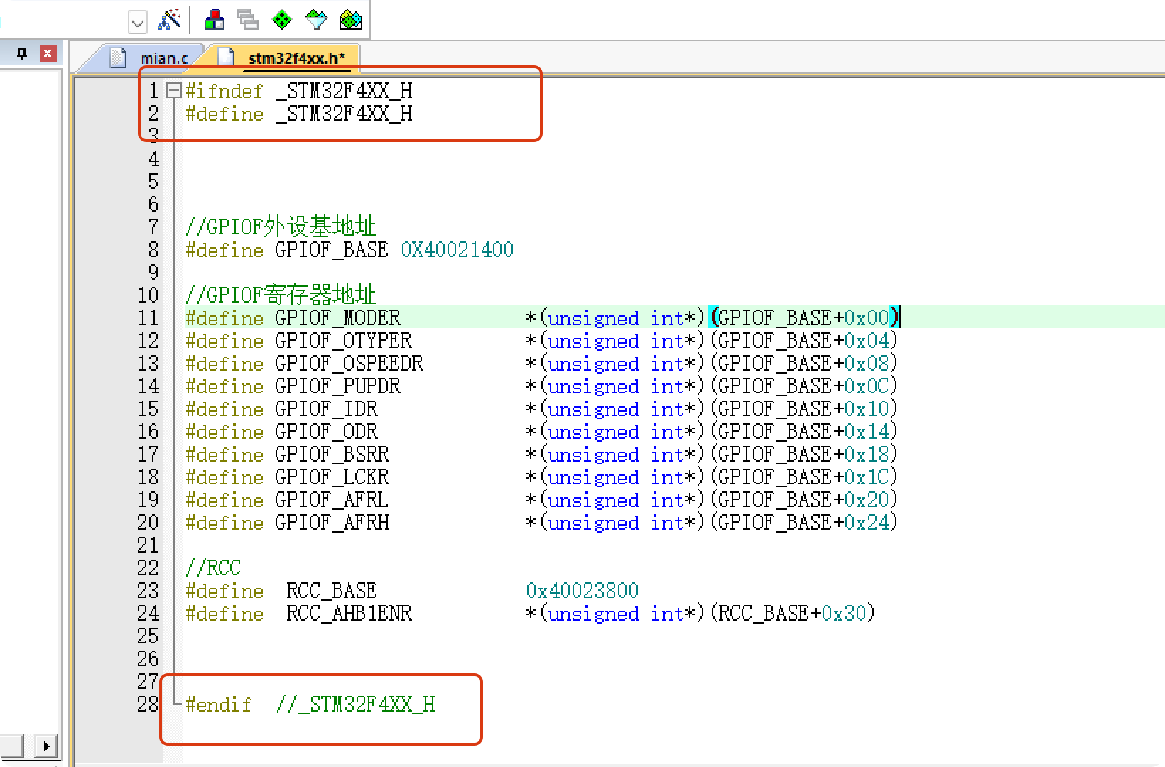 经过以上定义后,就可将main函数中的GPIO配置的寄存器操作进行修改,通过访问结构体的成员来操作寄存器