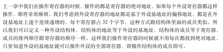 外设的每个寄存器都是32位的,而且地址都是连续的,都是基于基地址的偏移,也就是说是一块连续的内存空间。那就可以为这个外设的寄存器们创建一个结构体,成员的顺序就是按照地址由小到大的各个寄存器。
