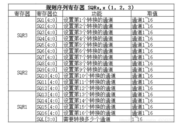 • 理解:在三个寄存器设置在那个 通道是第几个 转换。例如SQ1 中设置通道 5 为第一个转换。