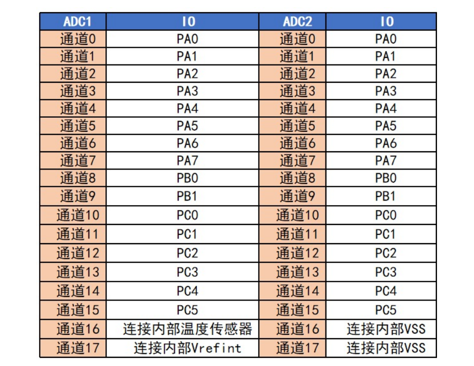 • 总共 2 个 ADC(ADC1,ADC2),每个 ADC 有 18 个转换通道: 16 个外部通道、 2 个内部通道 (温度传感器、内部参考电压),如图: