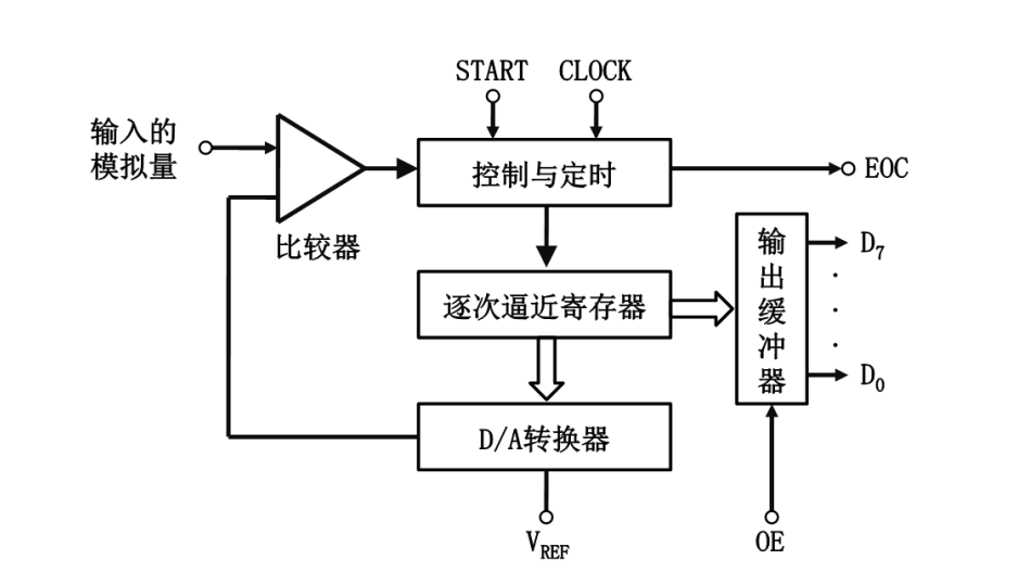 • 内部的"控制与定时"让"逐次逼近寄存器"在"D/A转换器(DAC)"产生一个模拟量与外界输入的模拟量进行比较,如果比外界的小了,那么重新生成比之前大的模拟量再次进行比较;如果比外界的大了,那么生成比之前小的模拟量进行比较,直到接近或者相等为止,最后将最接近的模拟量放进输出缓冲器中。
