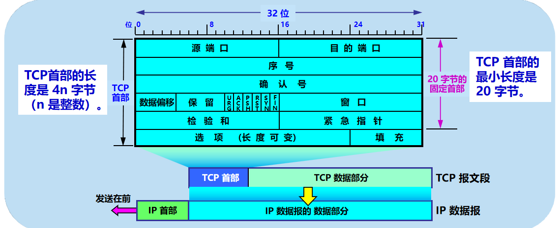 TCP报文段首部的前20个字节是固定的,后面有4n字节是根据需要而增加的选项(n是整数)。因此TCP首部的最小长度是20字节。